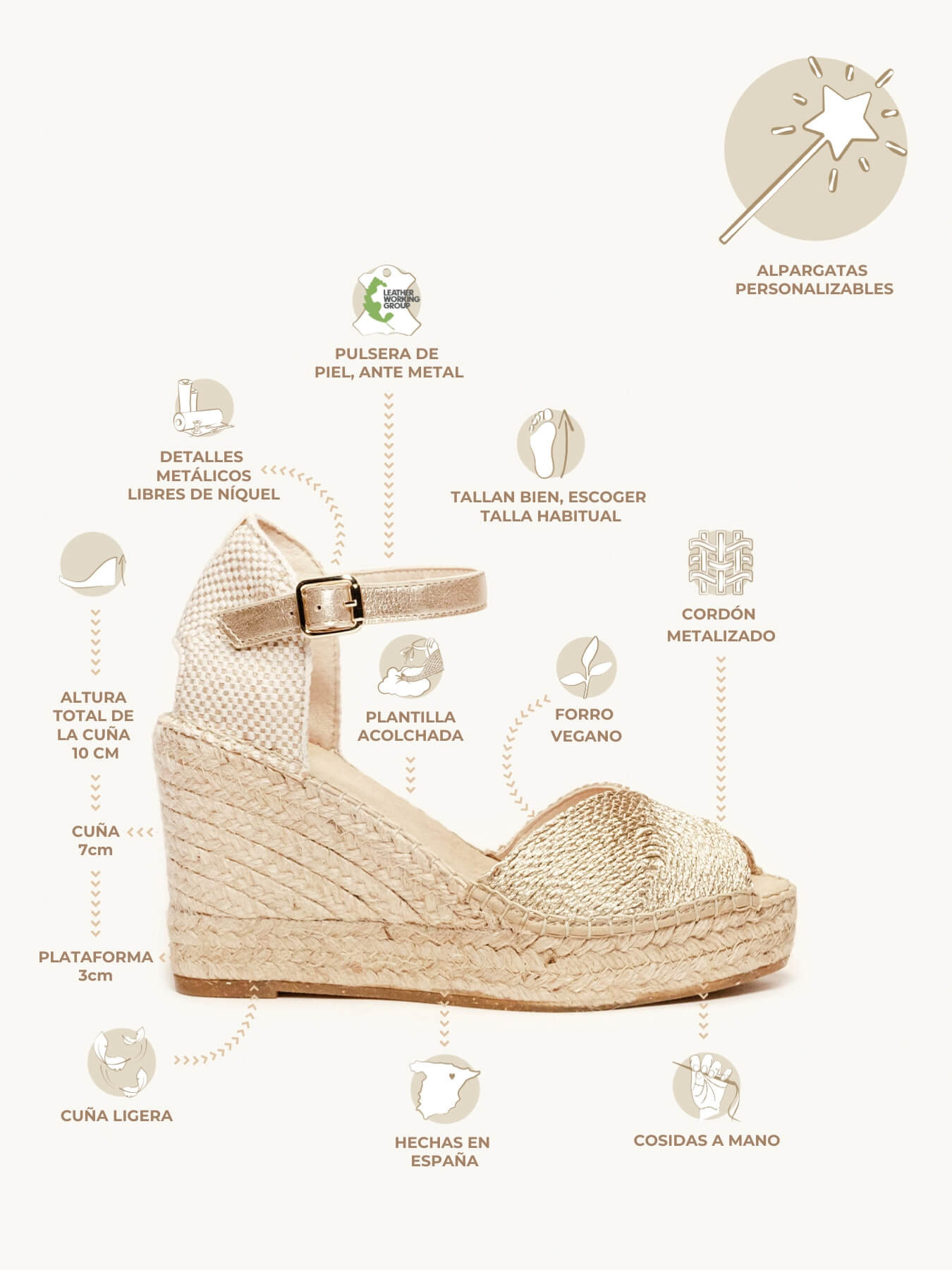 • Alpargata Cuña Alta: 10 cm totales (3 de plataforma + 7 de cuña).