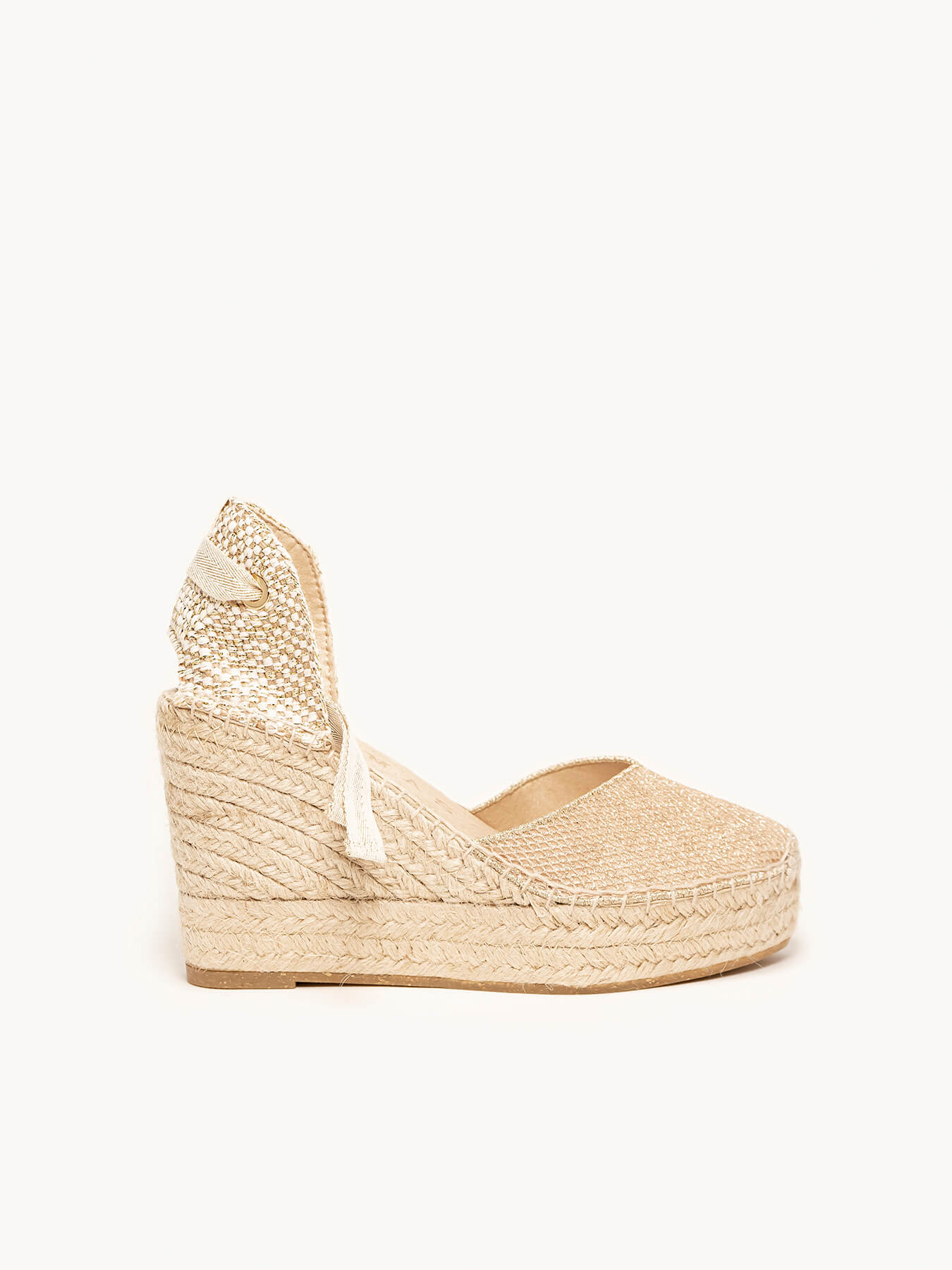 - Cuña de trenza de Yute natural con suela de goma reciclada mezclada con fibras naturales.