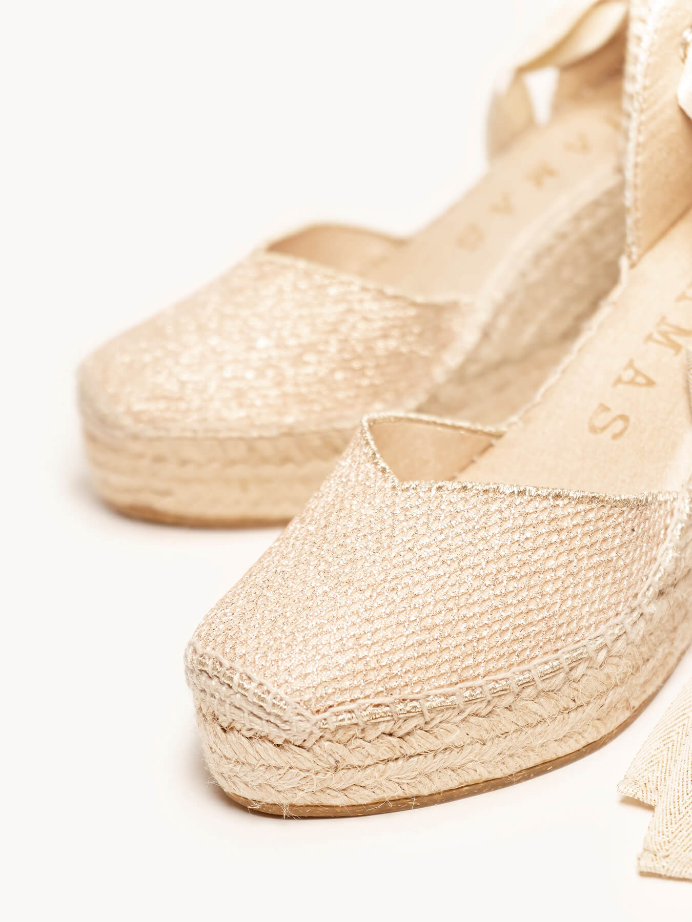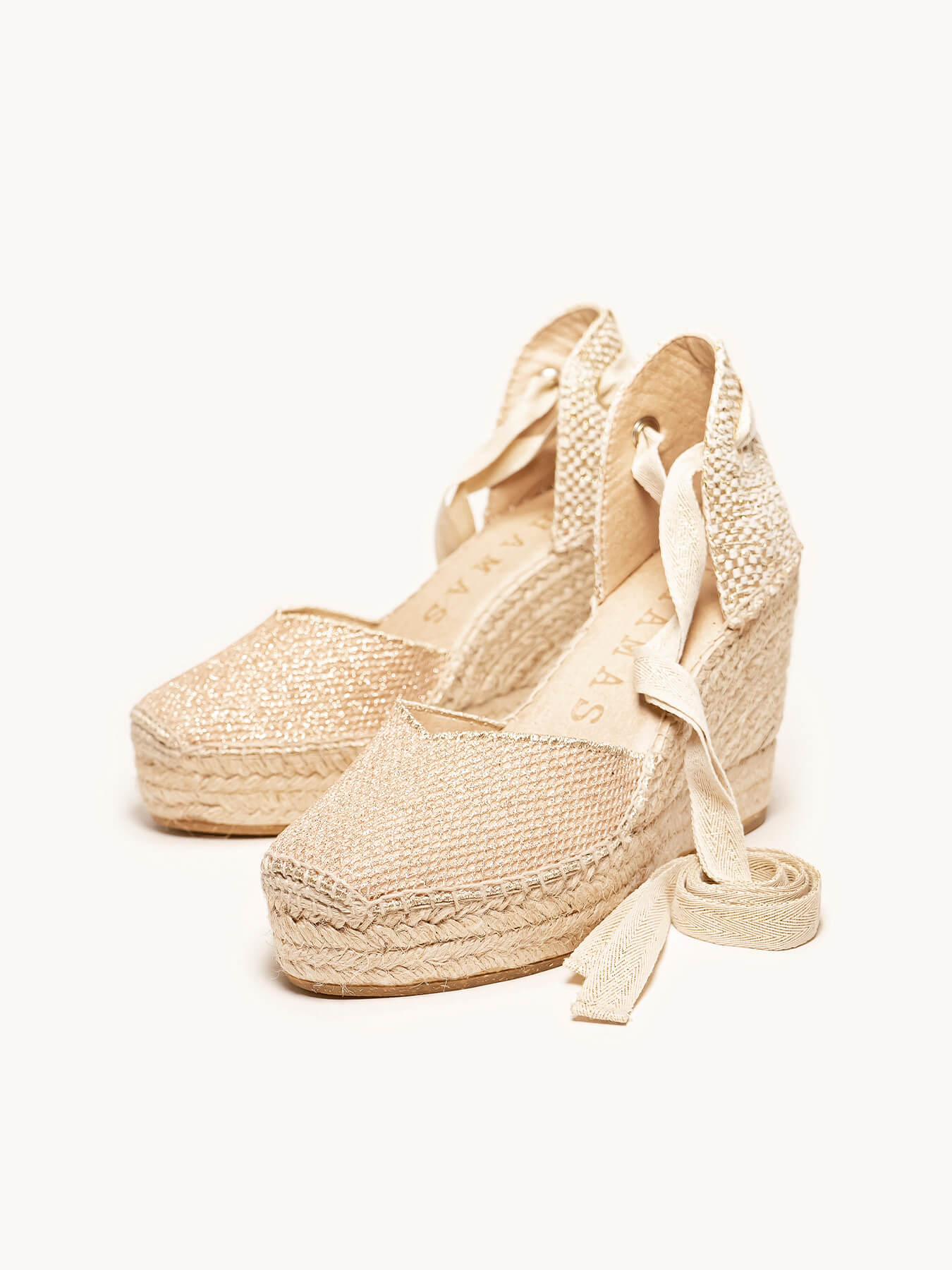 La alpargata de cuña alta Romero, es uno de nuestros modelos más especiales, perfecto para tu día. Las alpargatas de novia que podrás elegir como primera opción o como alpargatas de cambio. Conservarás la altura, sus cintas darán ese toque especial a tu vestido y llevarás las alpargatas cómodas que te permitirán disfrutar al máximo.