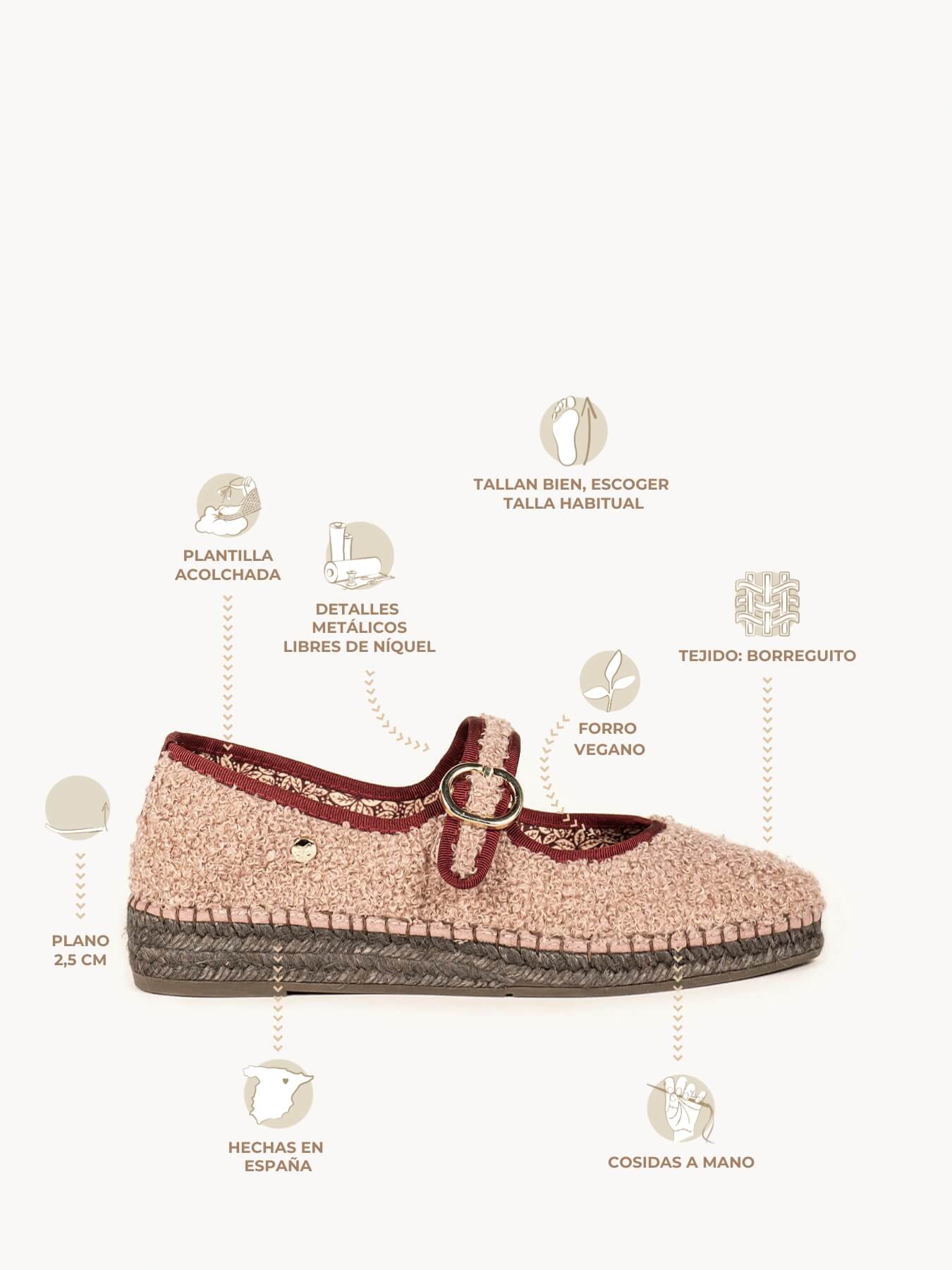 - El borreguito del modelo Azucena es de poliéster reciclado combinado con ribete de poliéster reciclado