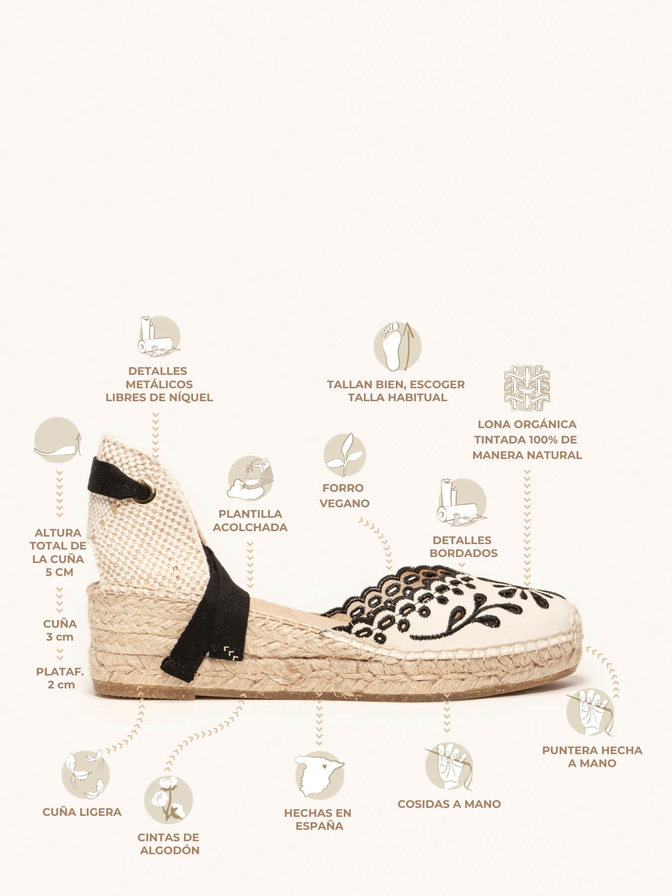 The Romero model is our most iconic model. Our Valencian espadrille with a sweetheart neckline and ribbons can be worn with your special mass looks, and also with your everyday looks. You can give it a special touch because the straps of the wedge espadrilles with straps can be changed.