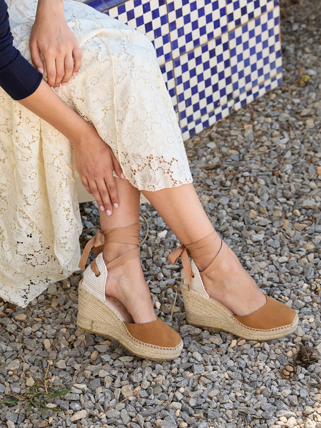 La alpargata de cuña alta Romero, es nuestro modelo más icónico. Una alpargata valenciana de escote corazón con cintas que podrás llevar con tus looks especiales y también con los del día a día. Podrás darle un toque especial porque las cintas se pueden cambiar.
