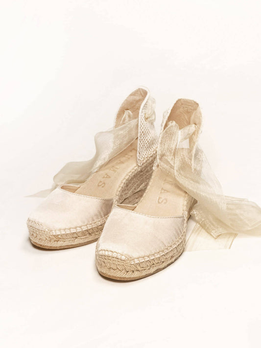 Nuestras alpargatas novia con cintas son súper cómodas! Alpargatas artesanales cosidas a mano en la Rioja por nuestros maestros artesanos, alpargatas novia sostenibles, con materiales reciclado, naturales, orgánicos y una selección de las mejores pieles certificadas por el "Leather Working Group". Alpargatas novia con cintas cómodas gracias a la plantilla acolchada que cubre toda la planta. Alpargatas novia con cintas en varias alturas, alpargatas de 10 cm y alpargatas de 7 cm que llevarás durante todo tu día. Las alpargatas con un toque rural chic, atemporal, especiall, único y original.