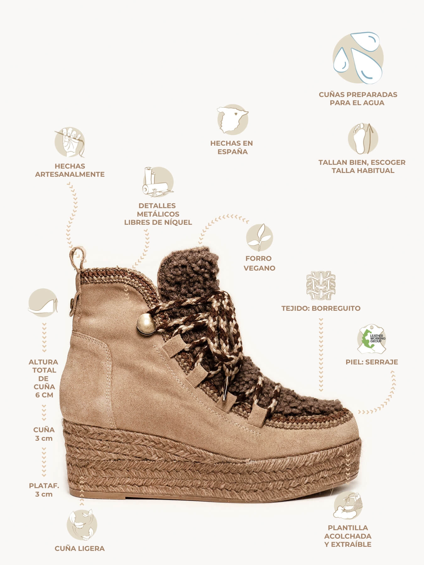 El modelo Abedul es un botín de mujer combinado con borreguillo y adorno de pasamanería, que esta temporada será una de tus favoritas. Gracias a su cremallera y sus cordones, este botón de invierno podrás ajustarlo perfectamente a tu pie y que así vayas aún más cómodo.
