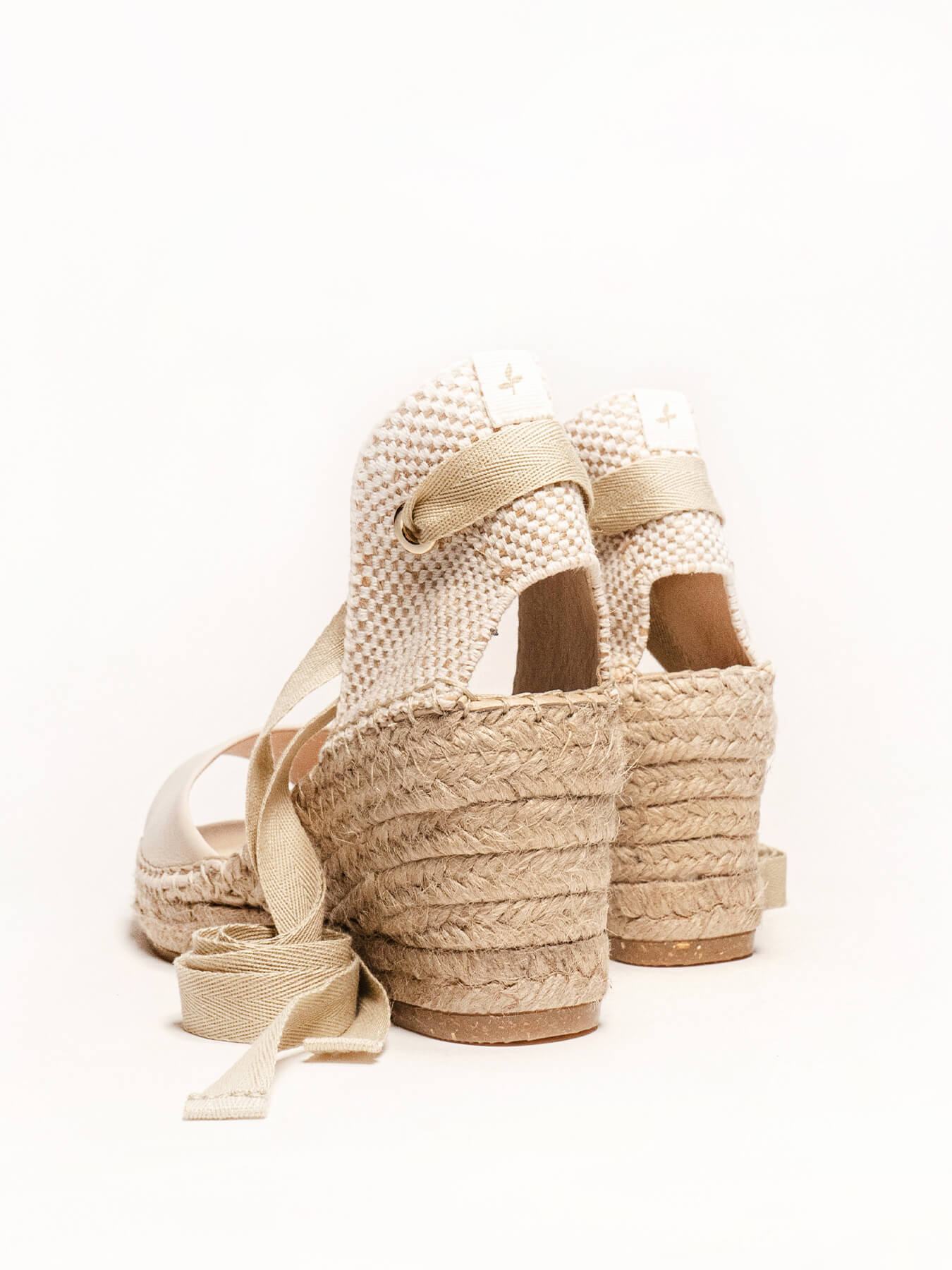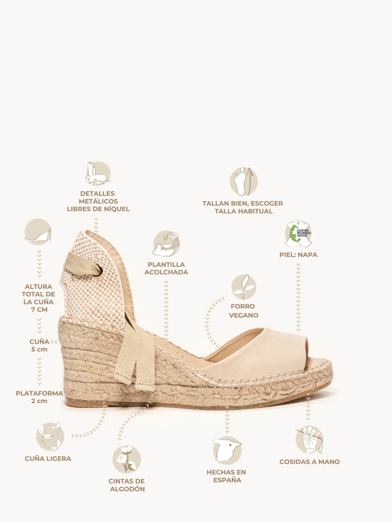 - Cuña de trenza de Yute natural con suela de goma reciclada mezclada con fibras naturales.
