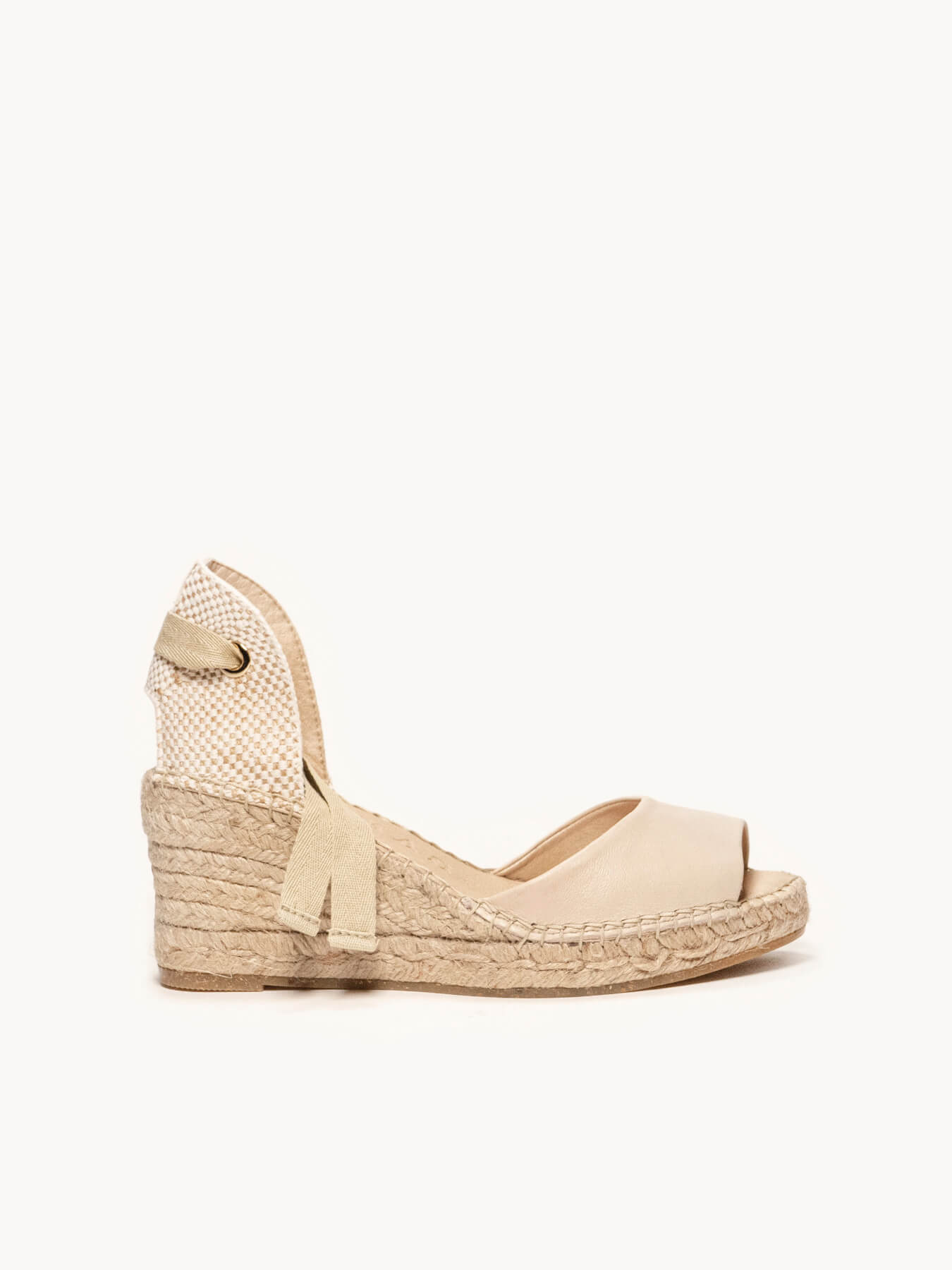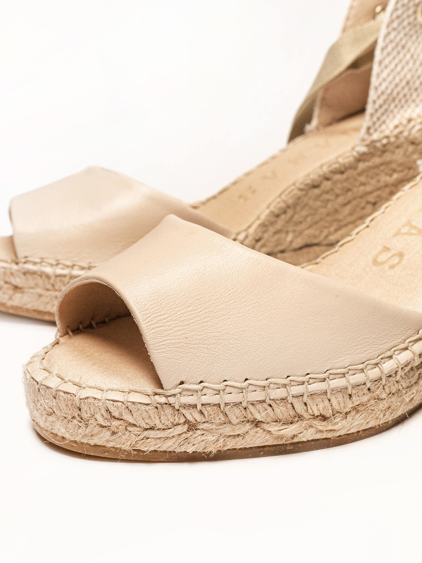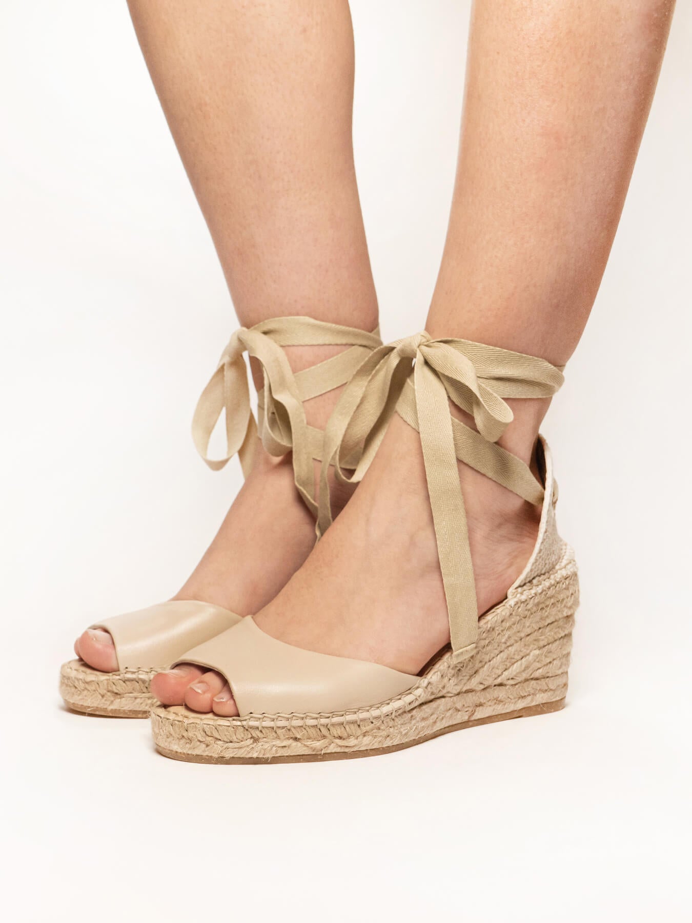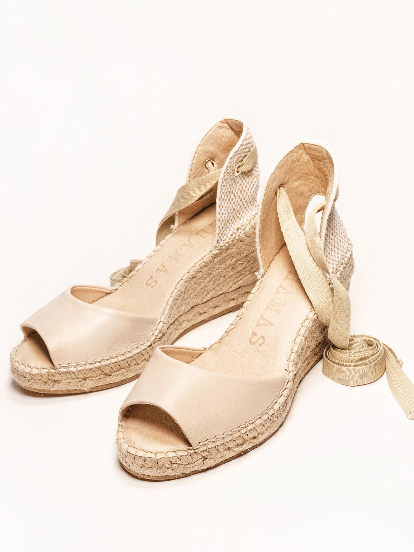 El modelo Azalea, es un modelo ideal para el buen tiempo. Nuestra sandalia con cintas y escote redondo es un modelo muy versátil, ideal para el día a día y también para darle un toque muy chic a los looks más especiales. Podrás darle un toque especial porque las cintas de la alpargata de cuña con cintas se pueden cambiar.