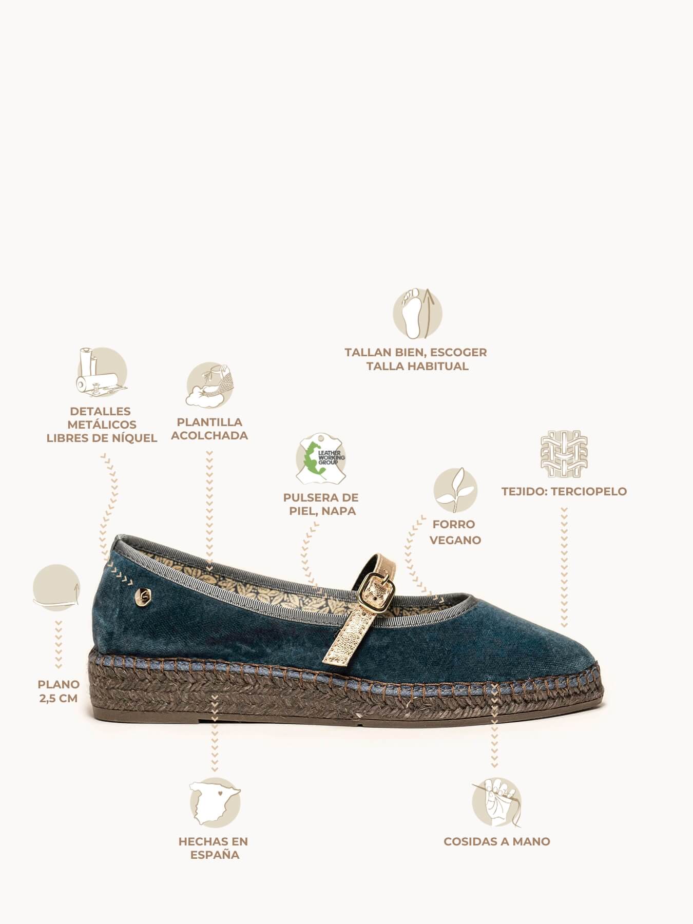 El modelo Gardenia, es nuestra bailarina de terciopelo. La podrás llevar tanto dentro como fuera de casa. Lleva una pequeña pulsera con hebilla para sujetar bien. Su pequeña cuña las hace muy cómodas y gracias a la forma de la punta, verás tu pie super estilizado.