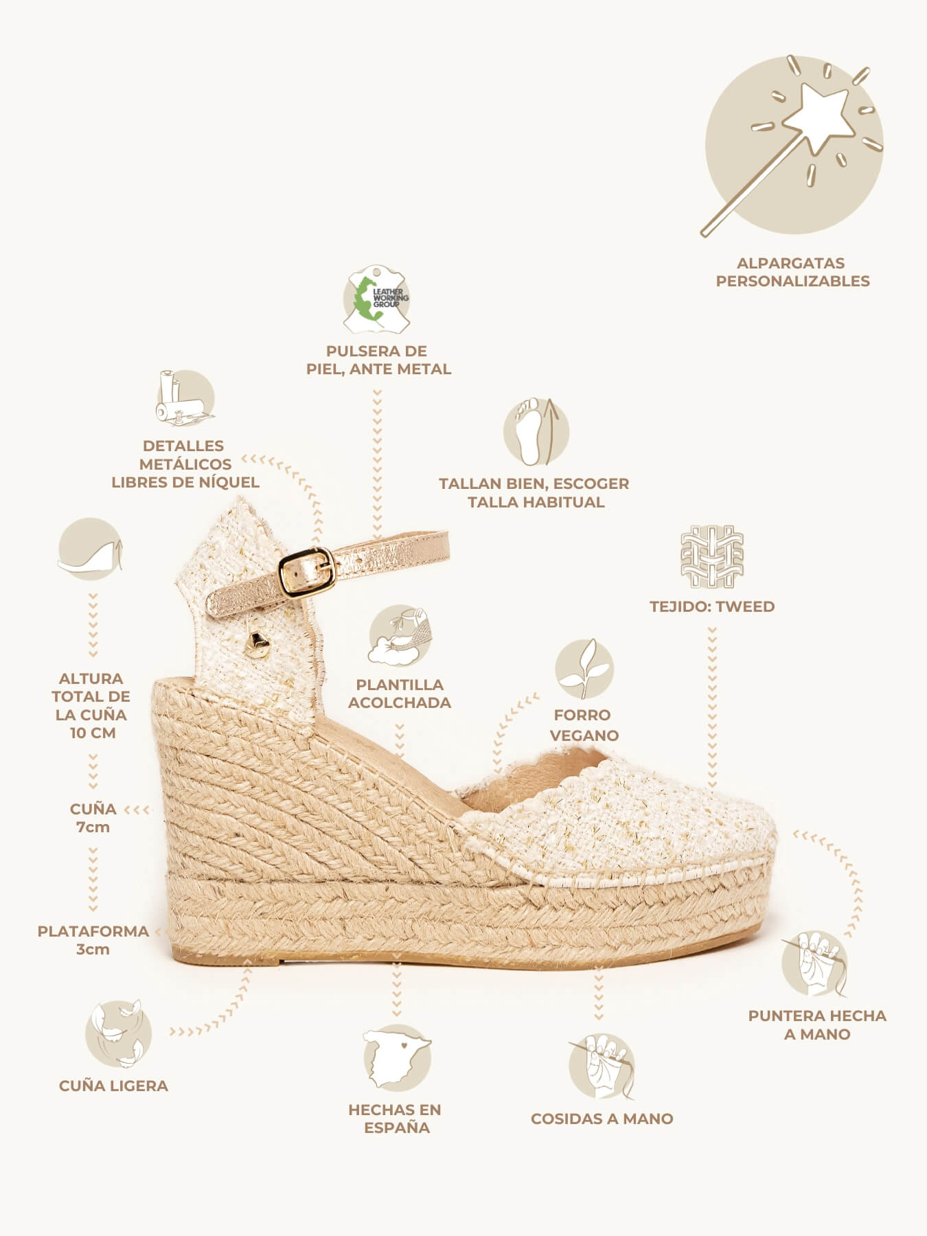Alpargata Cuña Alta: 10 cm totales (3 de plataforma + 7 de cuña).