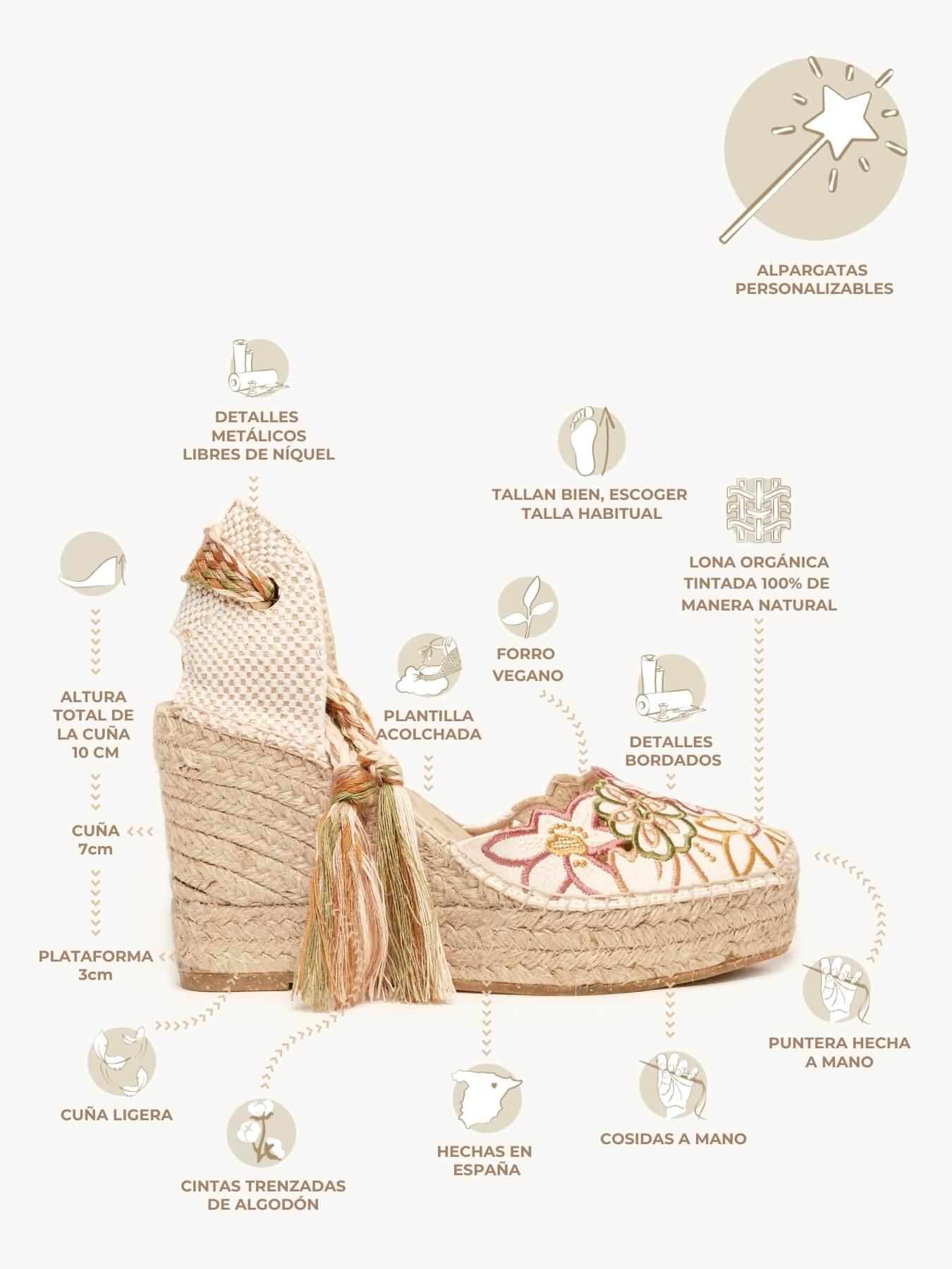 - El tejido bordado de la alpargata Romero es de algodón orgánico tintado con tintes 100% naturales.