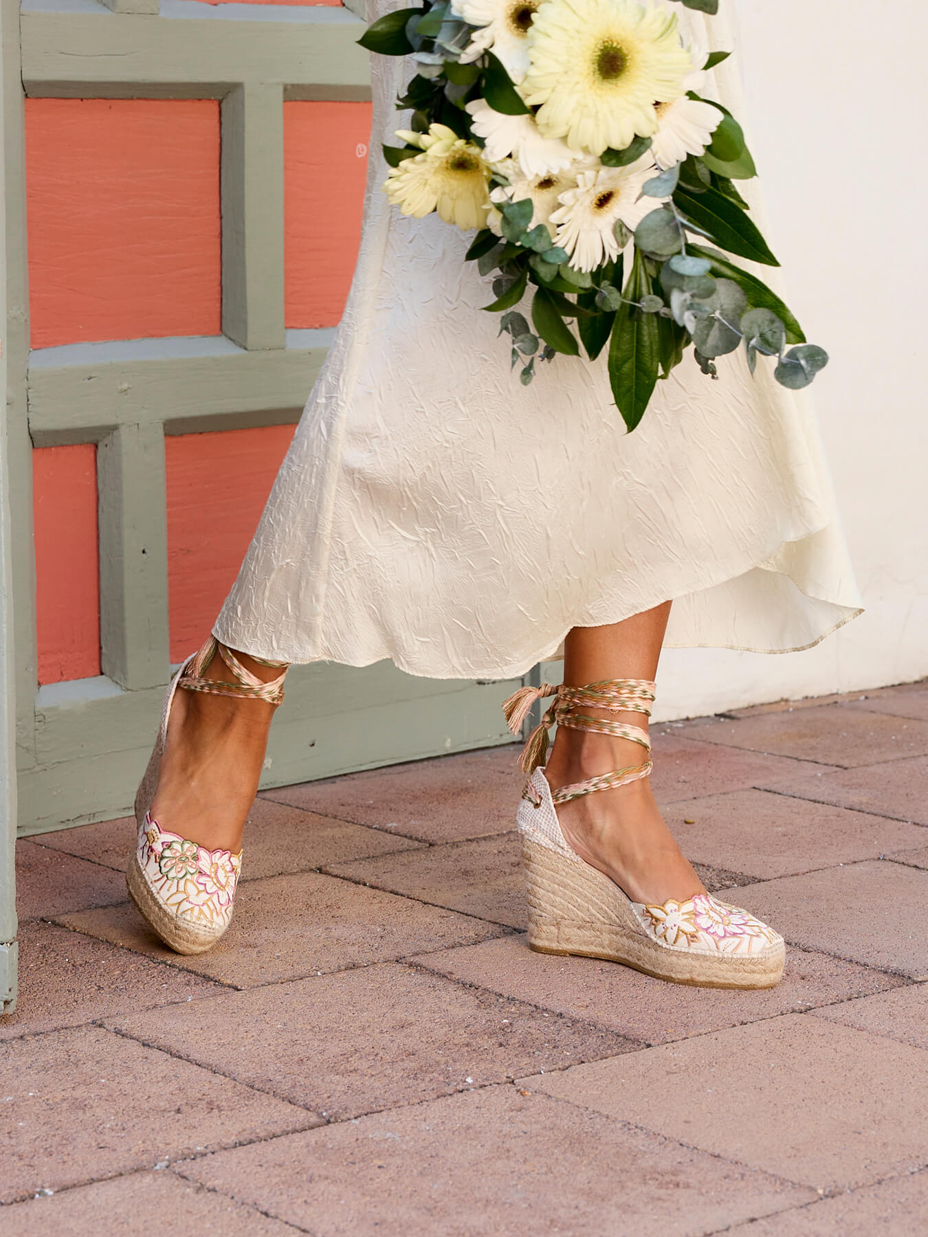 La alpargata de cuña alta Romero, es nuestro modelo más icónico. Una alpargata valenciana de escote corazón con cintas que podrás llevar con tus looks especiales y también con los del día a día. Podrás darle un toque especial porque las cintas se pueden cambiar.