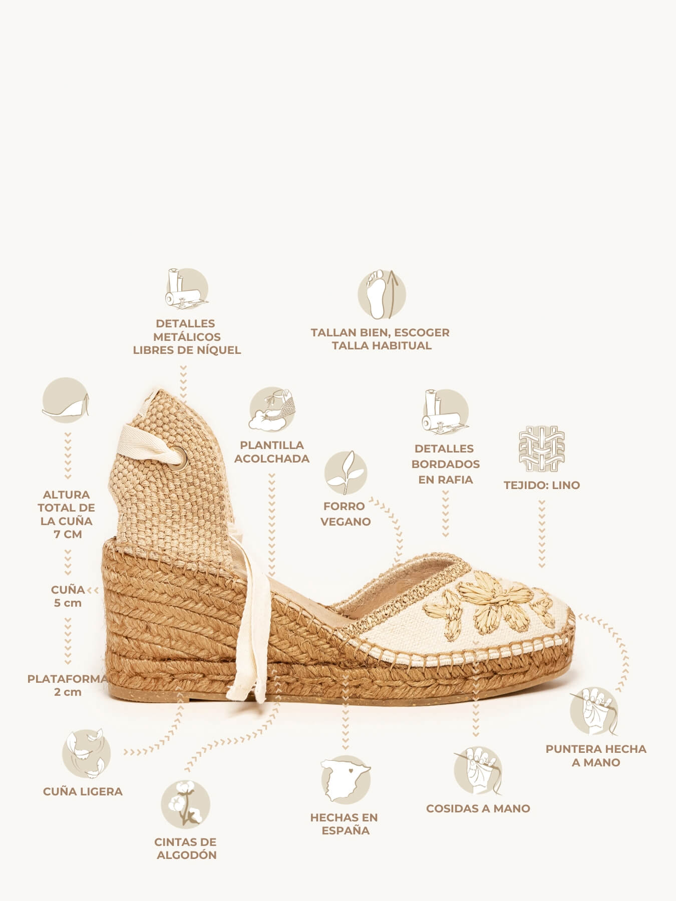 - Cuña de trenza de Yute natural con suela de goma reciclada mezclada con fibras naturales.