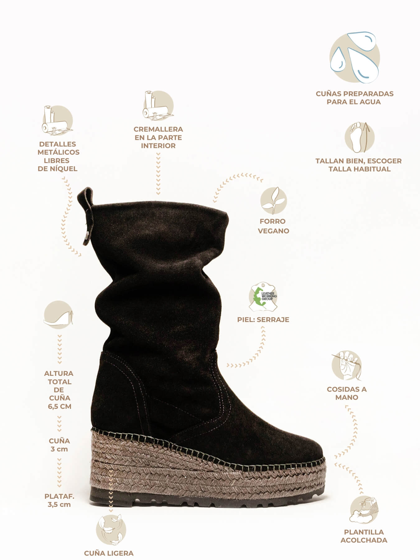 El modelo Sauce, es la bota estilo 'Boho', una bota de mujer que podrás llevar con la caña estirada y arrugada. Esta bota de cuña de invierno se ajustará perfectamente a tu pie con su cremallera lateral y que así vayas super cómoda.