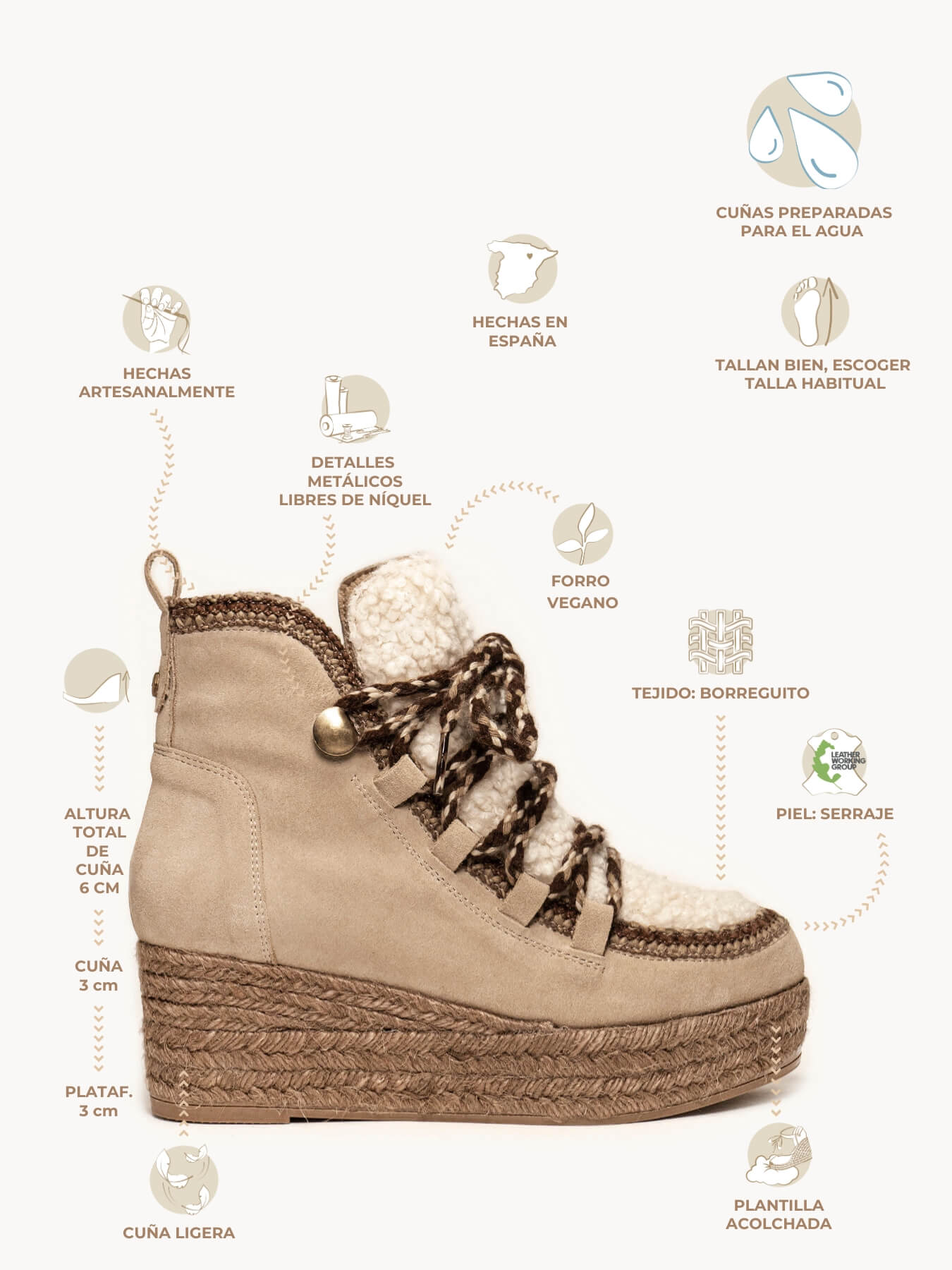 El modelo Abedul es un botín de mujer combinado con borreguillo y adorno de pasamanería, que esta temporada será una de tus favoritas. Gracias a su cremallera y sus cordones, este botón de invierno podrás ajustarlo perfectamente a tu pie y que así vayas aún más cómodo.