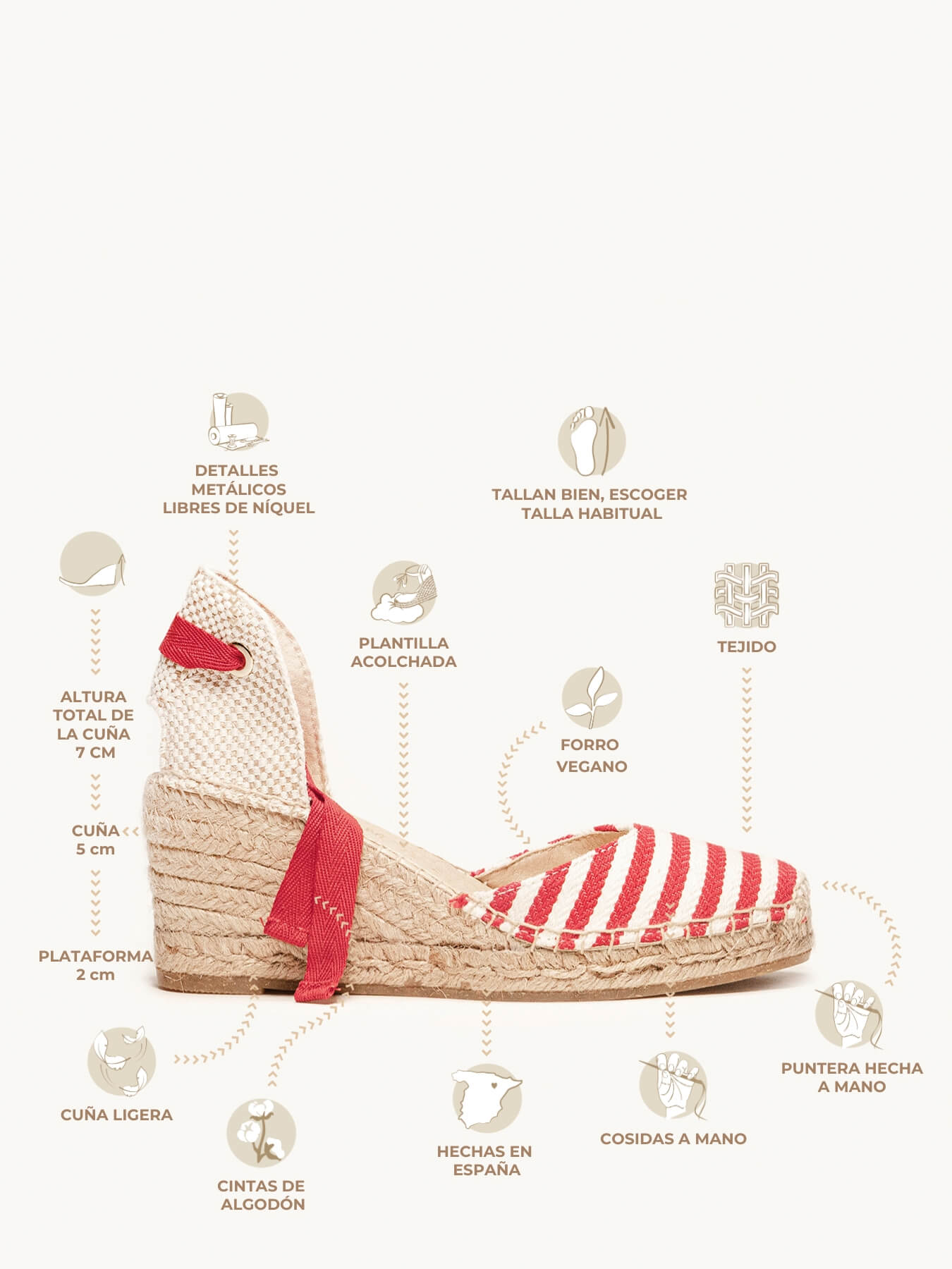 - Cuña de trenza de Yute natural con suela de goma reciclada mezclada con fibras naturales.