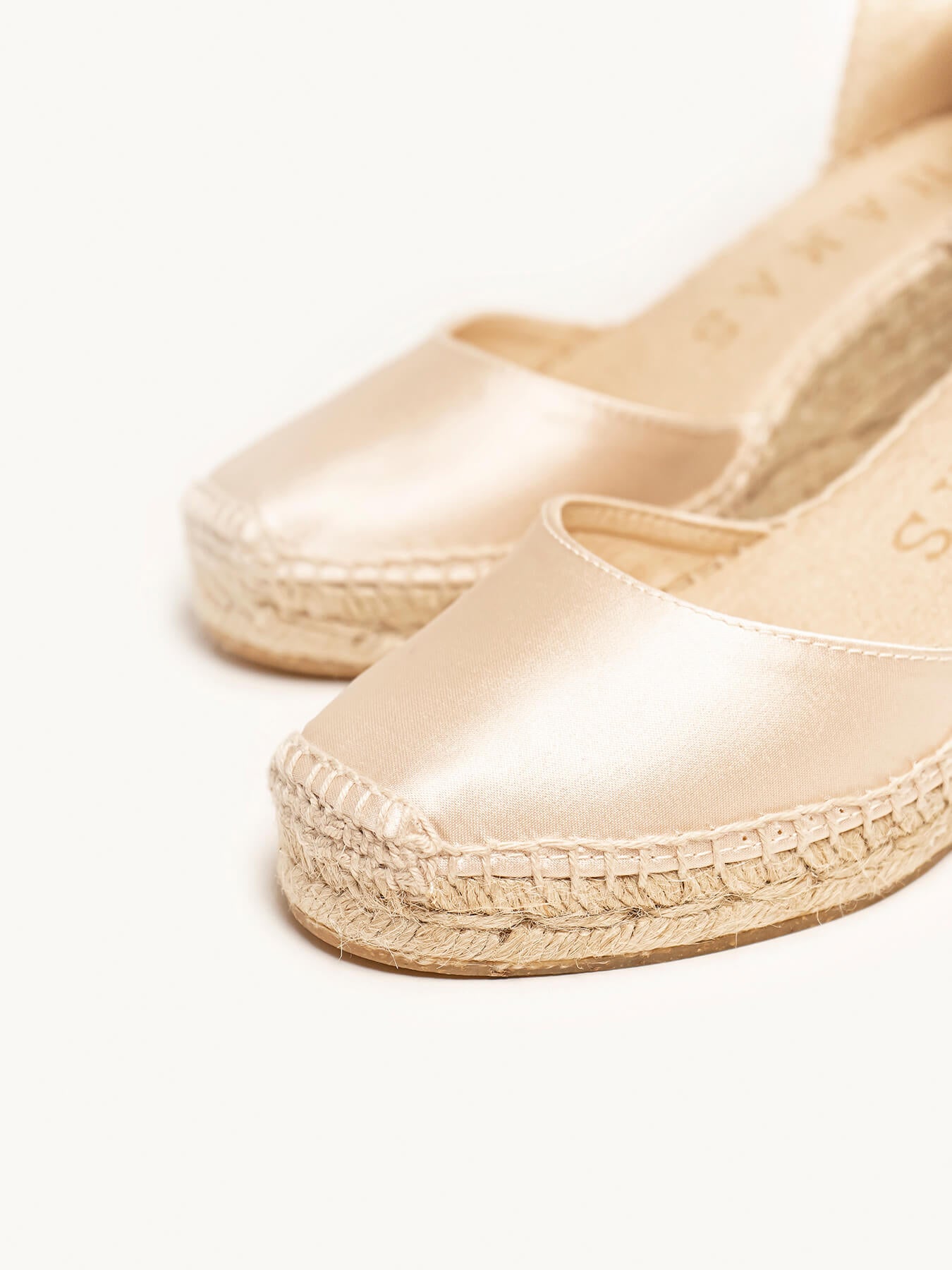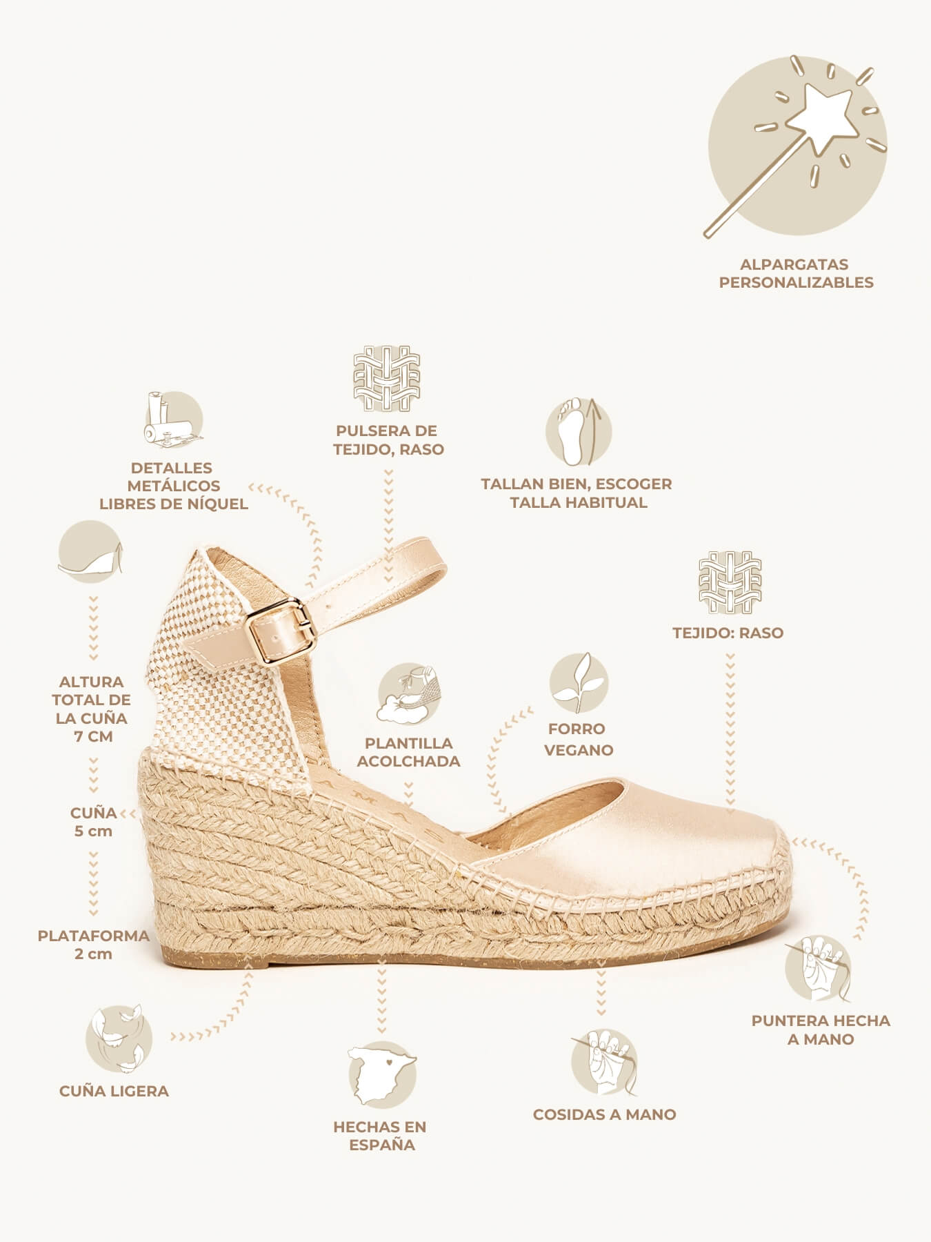 - Initiales sur le compensé, vous pouvez choisir les deux initiales que vous préférez et nous les placerons sur le talon compensé de vos espadrilles de mariée.