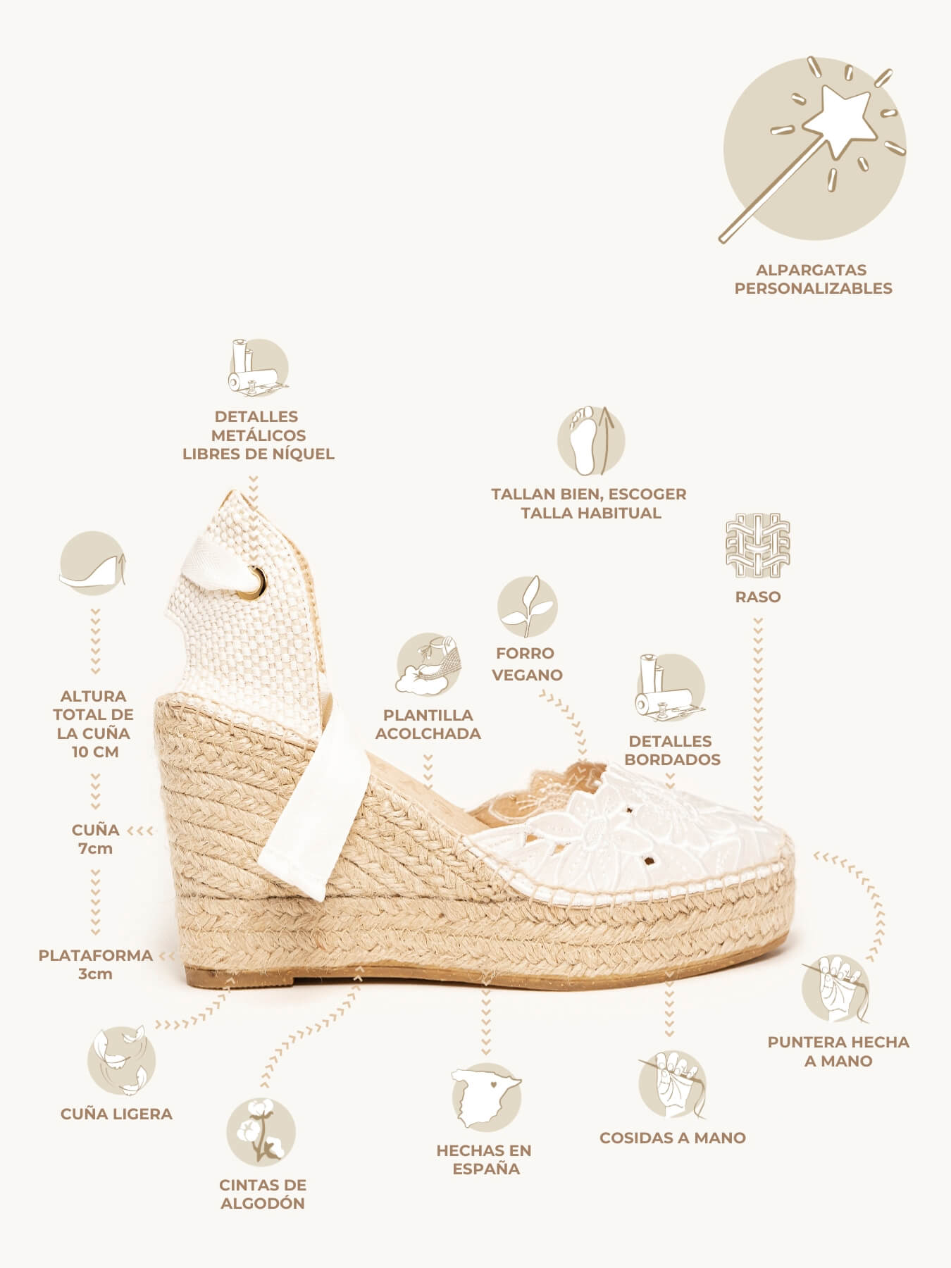 - Iniciales en la cuña, podrás elegir las dos iniciales que prefieras y las colocaremos en la cuña de tus alpargatas de novia.