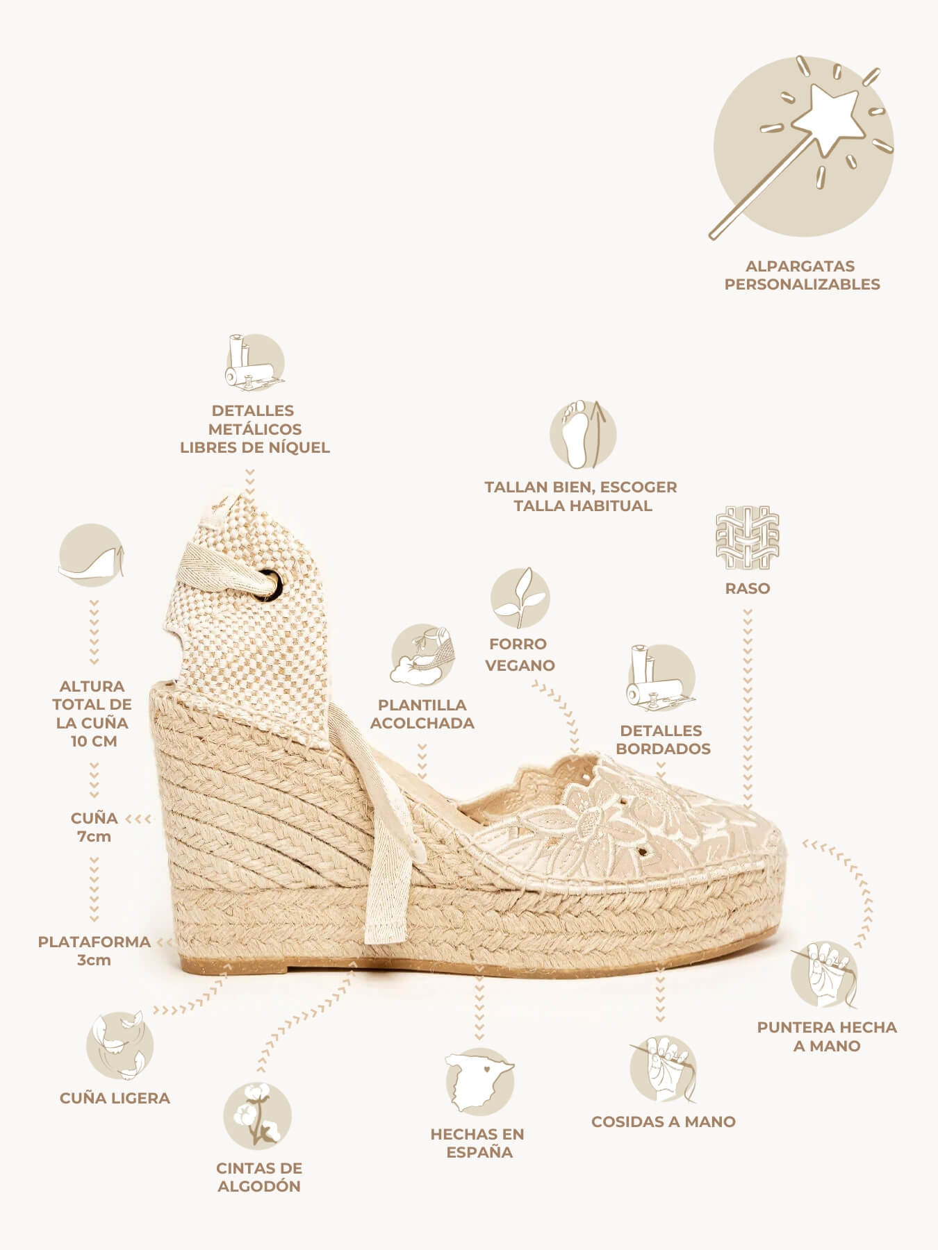 - Cuña de trenza de Yute natural con suela de goma reciclada mezclada con fibras naturales.