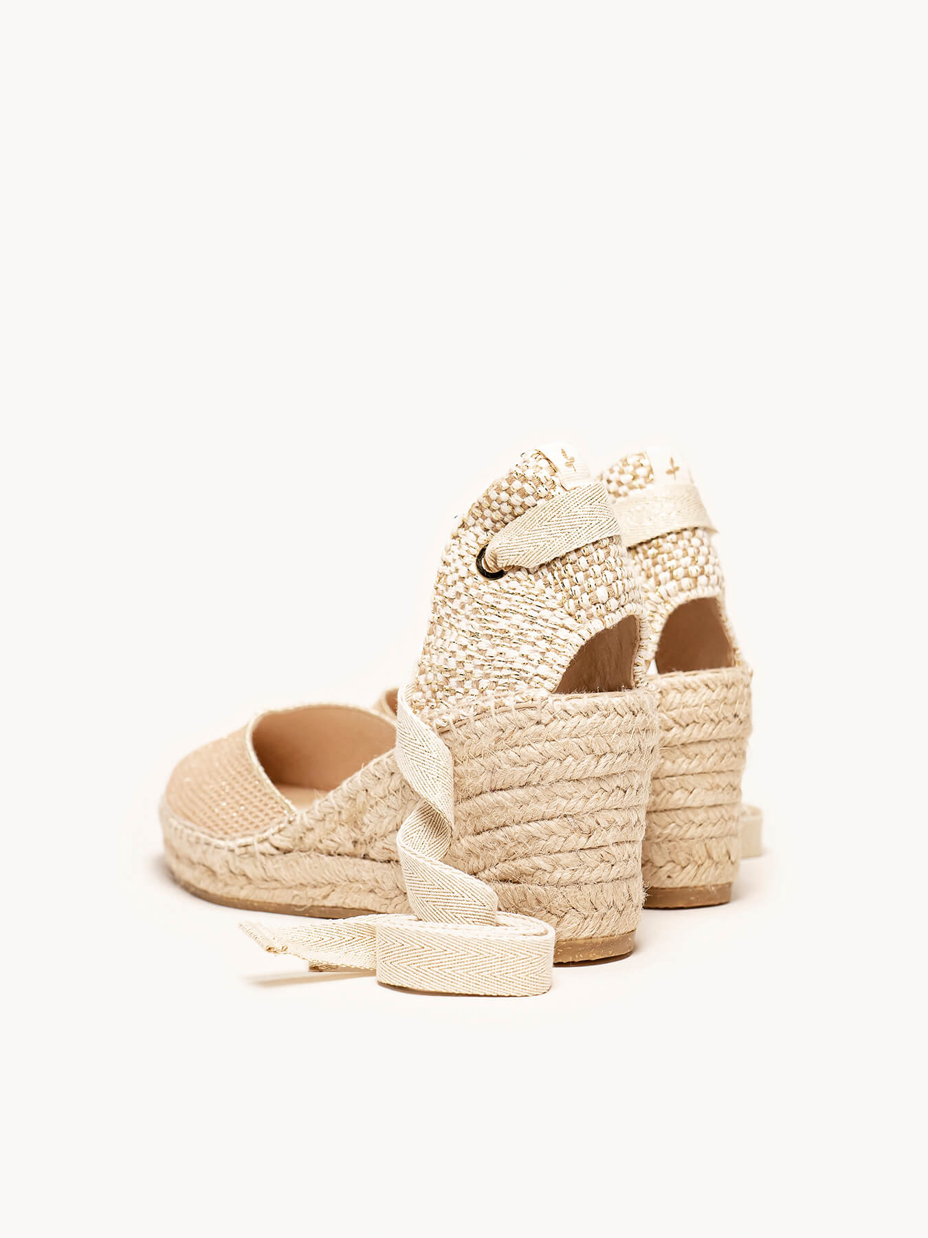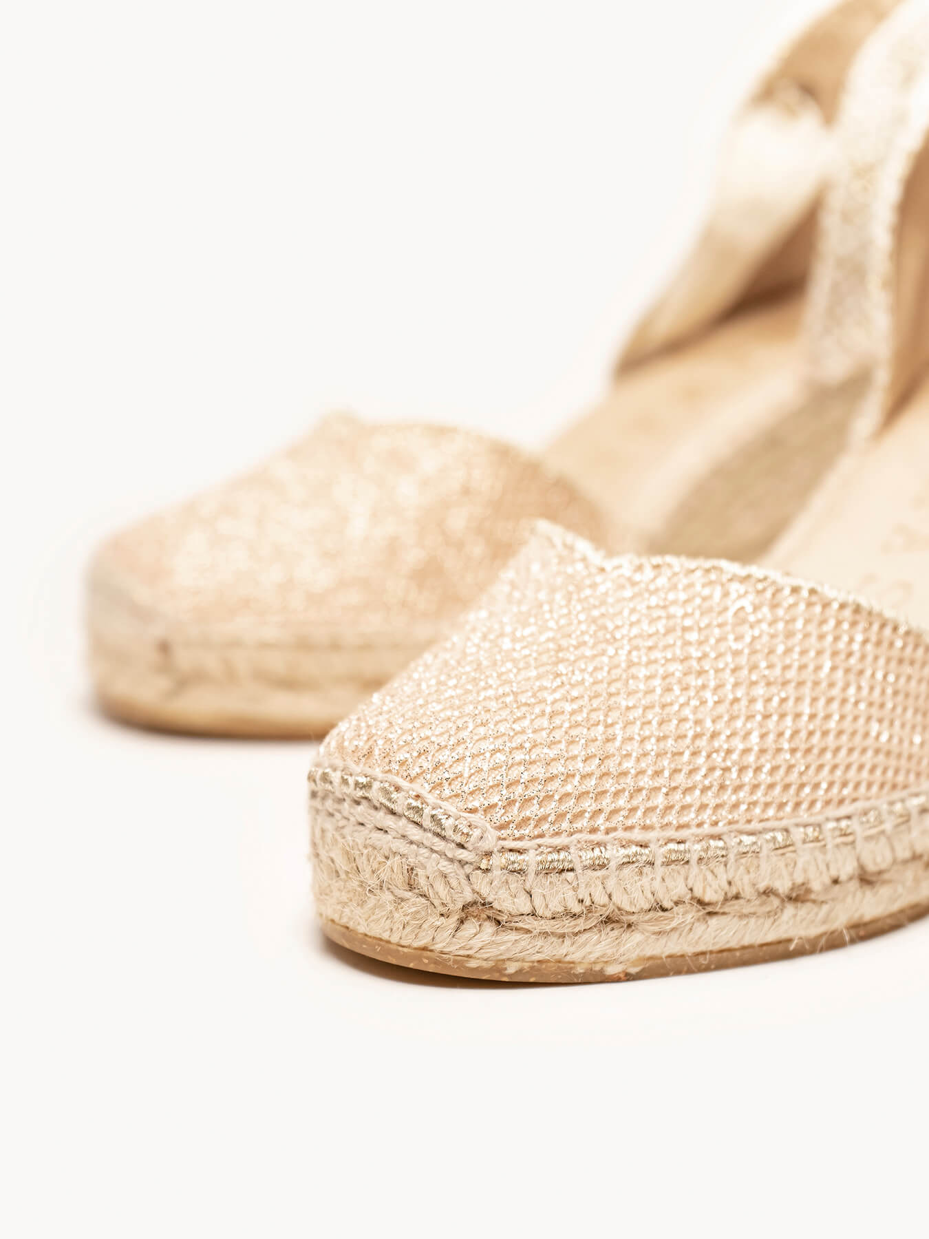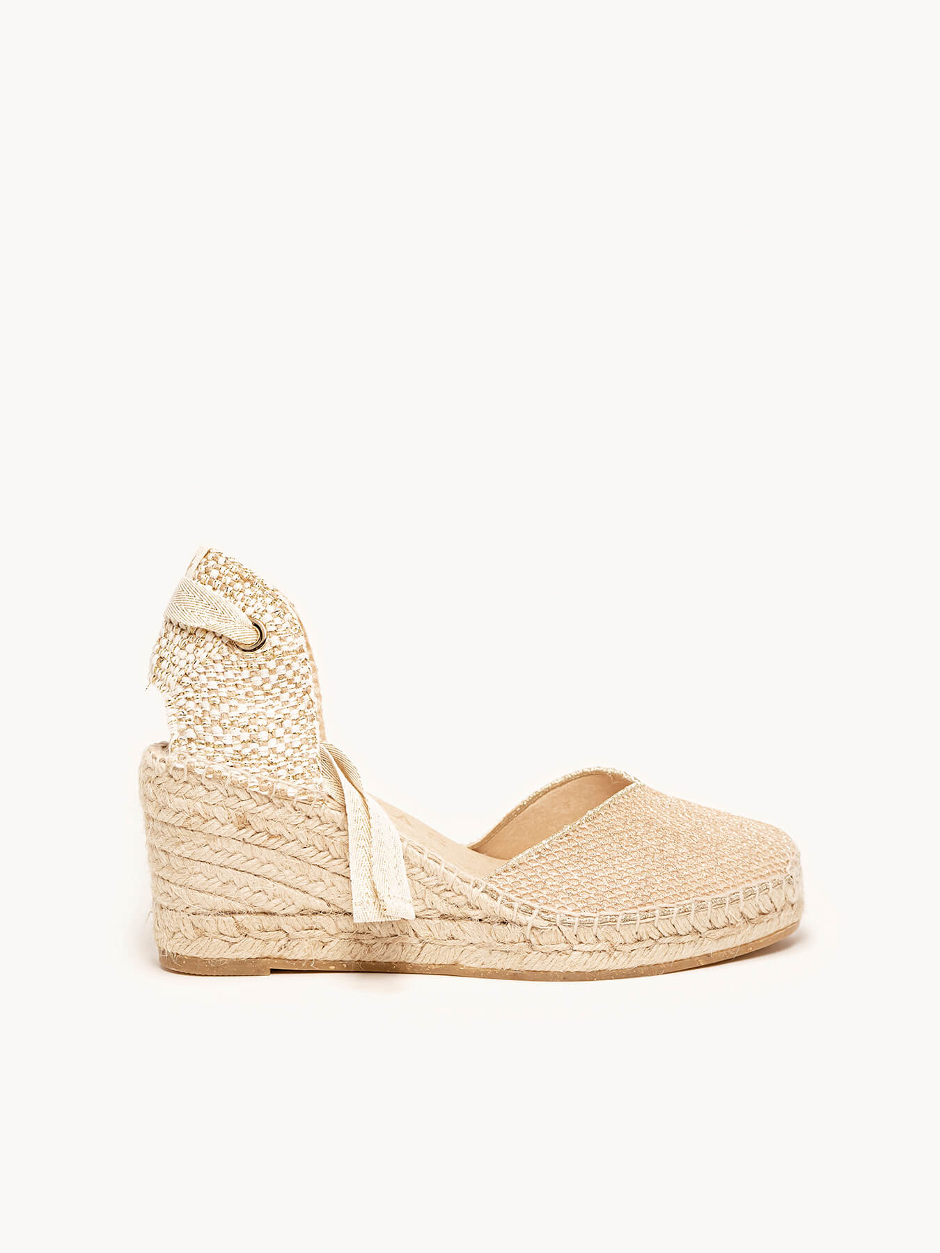 - Cuña de trenza de Yute natural con suela de goma reciclada mezclada con fibras naturales.