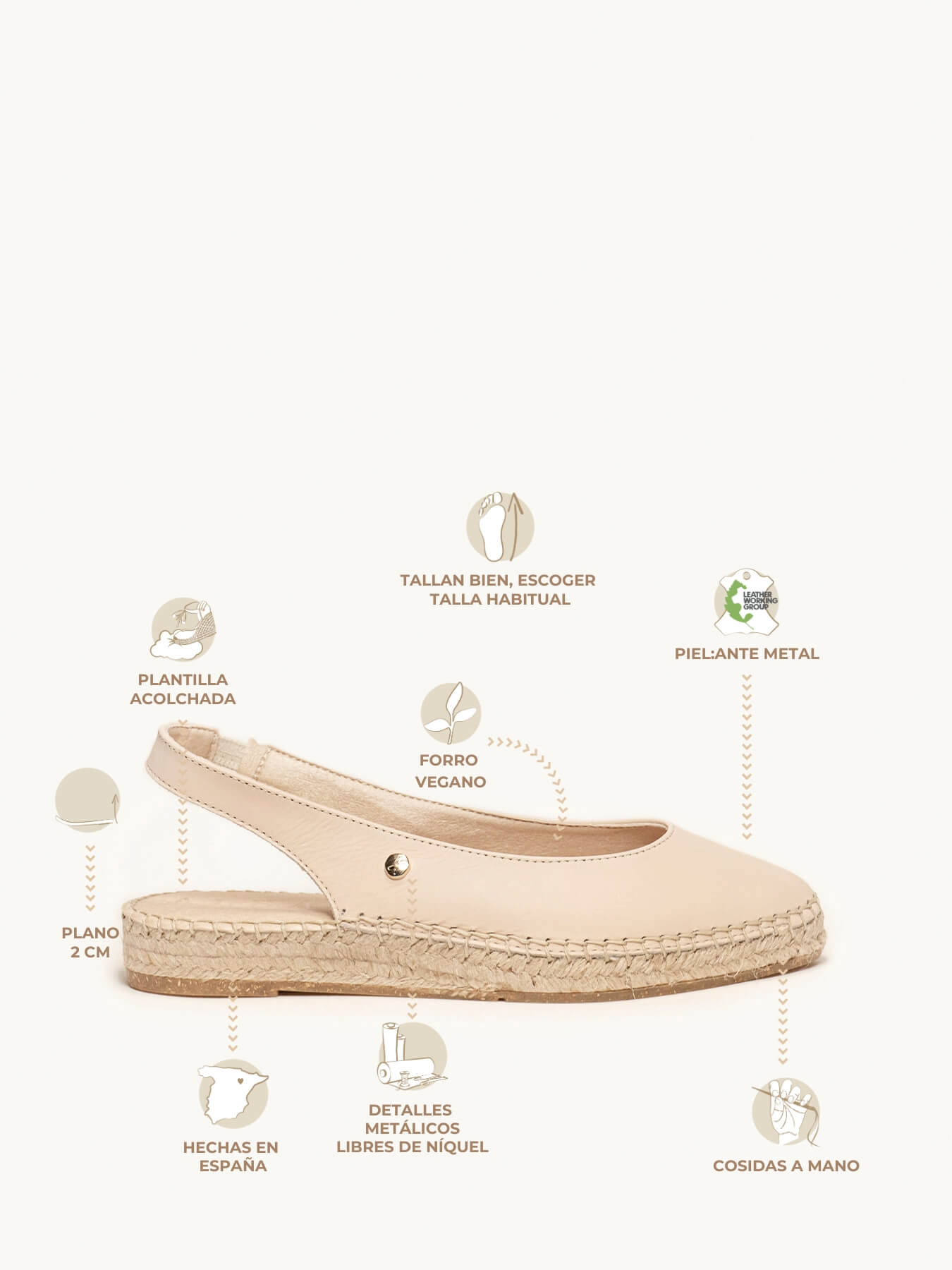 - La Napa de la alpargata Camelia está certificada por el Leather Working Group (una organización que promueve prácticas ambientales sostenibles) El forro y la plantilla son de micro fibra transpirable y anti bacteriana. Suela de trenza de Yute natural con goma reciclada mezclada con fibras naturales. Elementos metálicos libres de níquel. Hilo de cosido a mano de algodón.