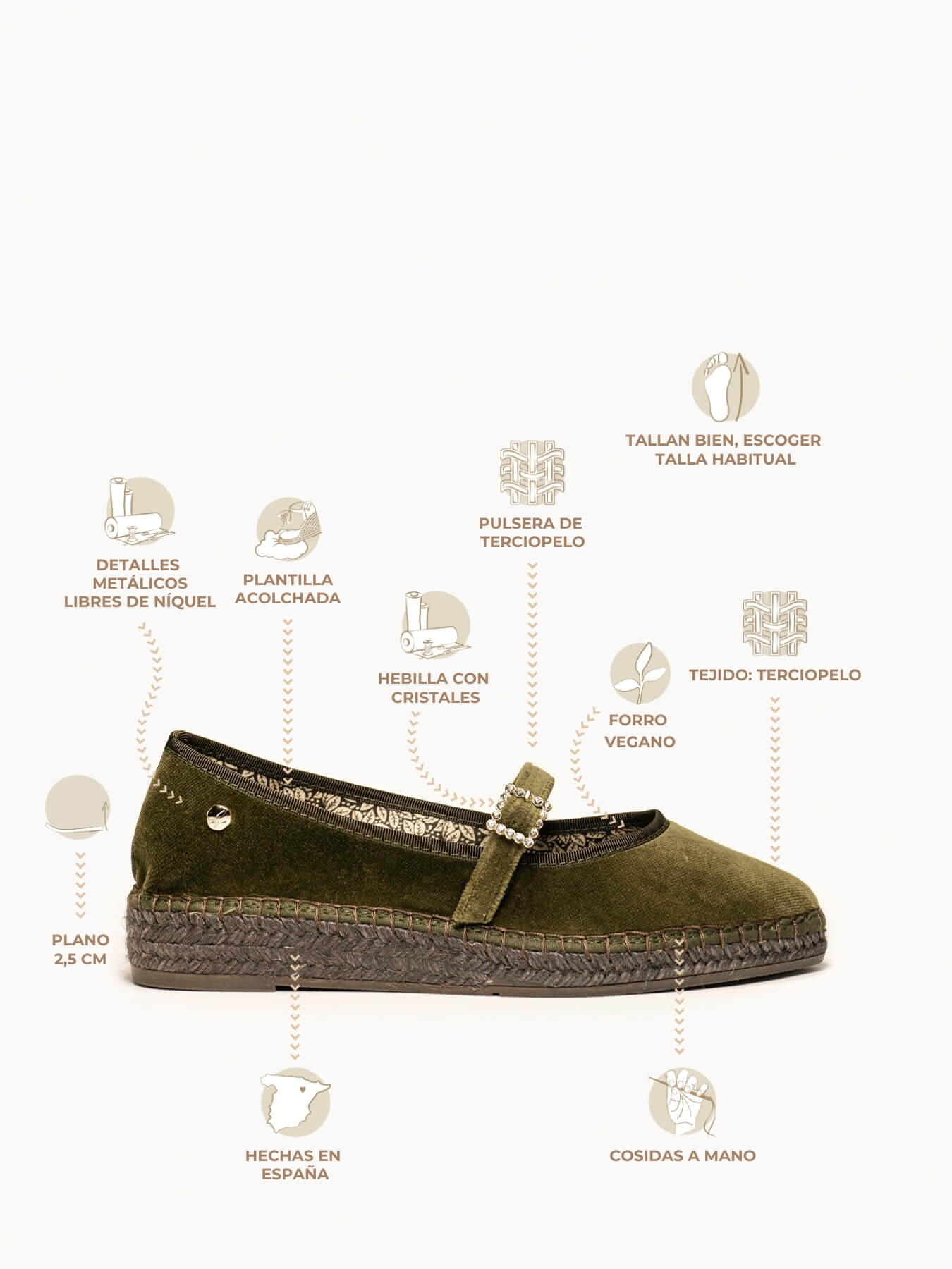 El modelo Gardenia, es nuestra bailarina de terciopelo. La podrás llevar tanto dentro como fuera de casa. Lleva una pequeña pulsera con hebilla para sujetar bien. Su pequeña cuña las hace muy cómodas y gracias a la forma de la punta, verás tu pie super estilizado.