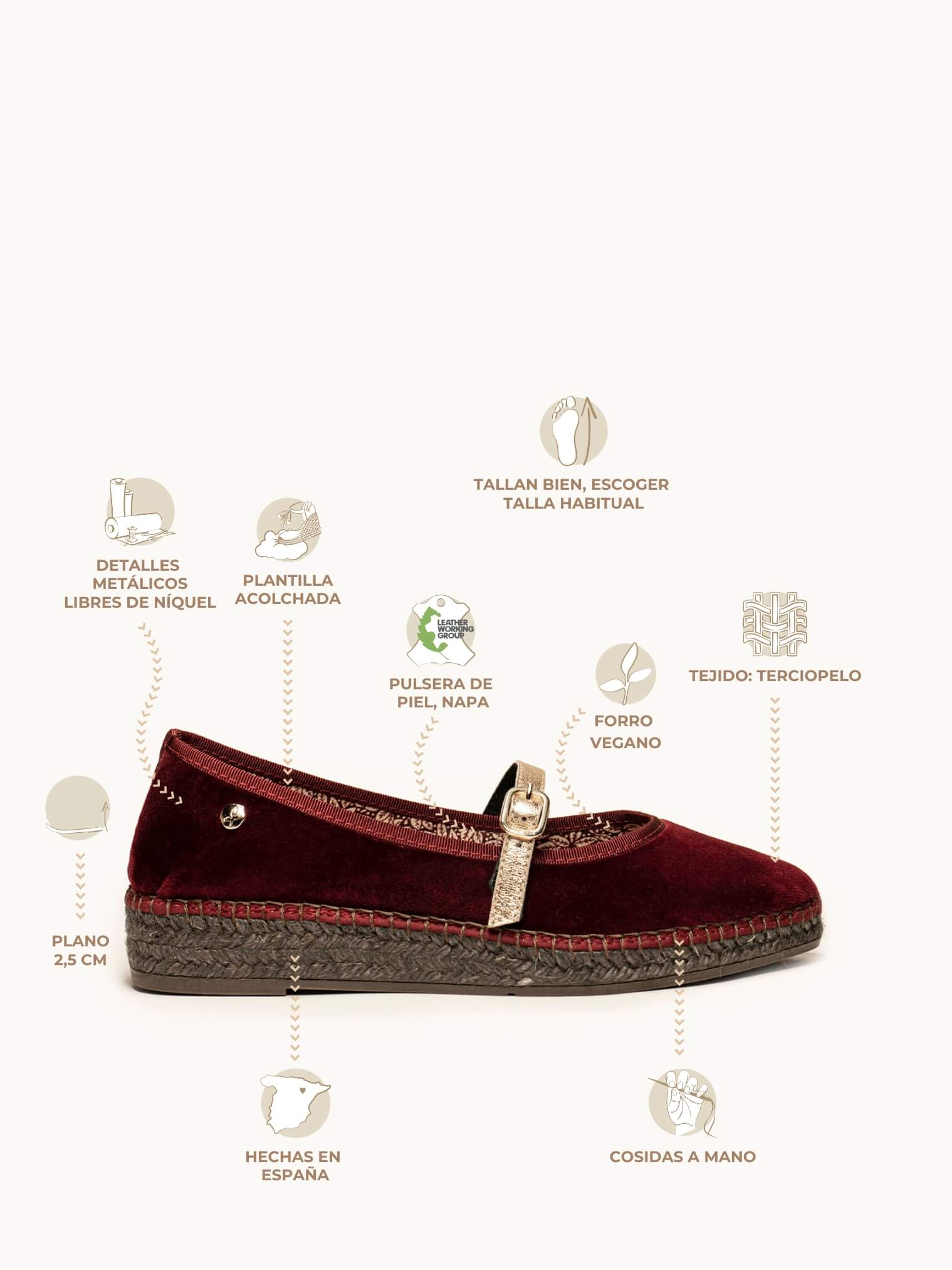 El modelo Gardenia, es nuestra bailarina de terciopelo. La podrás llevar tanto dentro como fuera de casa. Lleva una pequeña pulsera con hebilla para sujetar bien. Su pequeña cuña las hace muy cómodas y gracias a la forma de la punta, verás tu pie super estilizado.