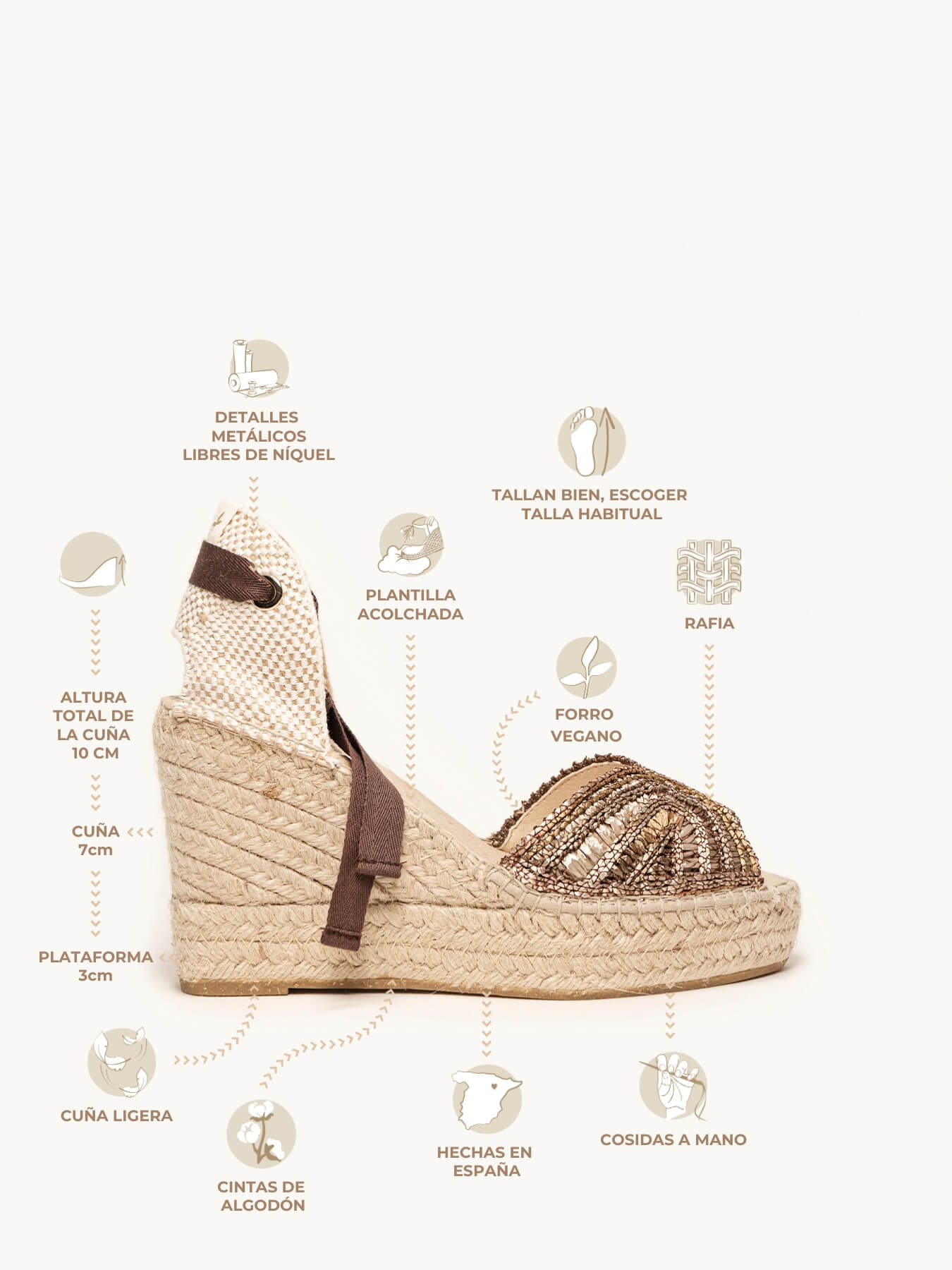 - Cuña de trenza de Yute natural con suela de goma reciclada mezclada con fibras naturales.