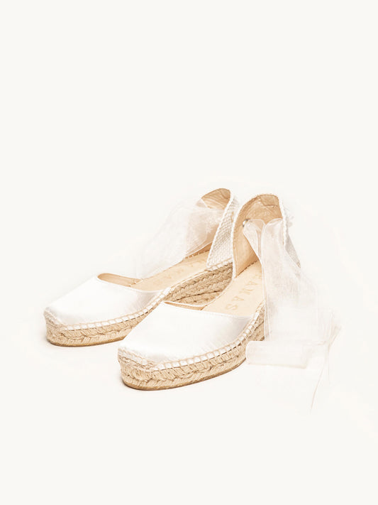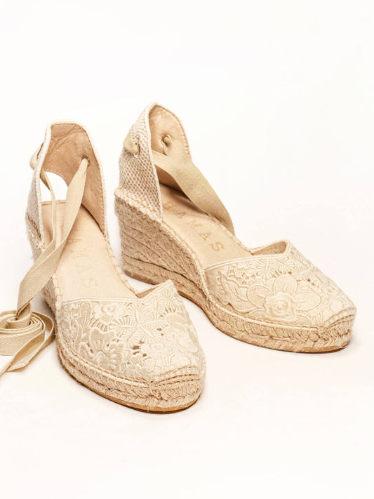 Alhamas sont des espadrilles confortables, car la semelle intérieure rembourrée que nous avons placée sur la semelle en fait les espadrilles de mariée les plus confortables au monde. Espadrilles mariée compensées hautes, espadrilles mariée compensées demies, espadrilles à plate-forme et espadrilles plates sont les 4 hauteurs qu'Alhamas propose dans sa collection d'espadrilles mariée. Vous pouvez également trouver des espadrilles avec ruban et des espadrilles avec bracelet et ballerines. Nous disposons également d'accessoires tels que des rubans en coton et des rubans en tulle pour que vous puissiez personnaliser vos espadrilles mariée de la manière la plus spéciale. Espadrilles cousues à la main à La Rioja par nos maîtres artisans, des espadrilles artisanales comme nos grands-parents le faisaient tout au long de leur vie, à feu doux et point par point.