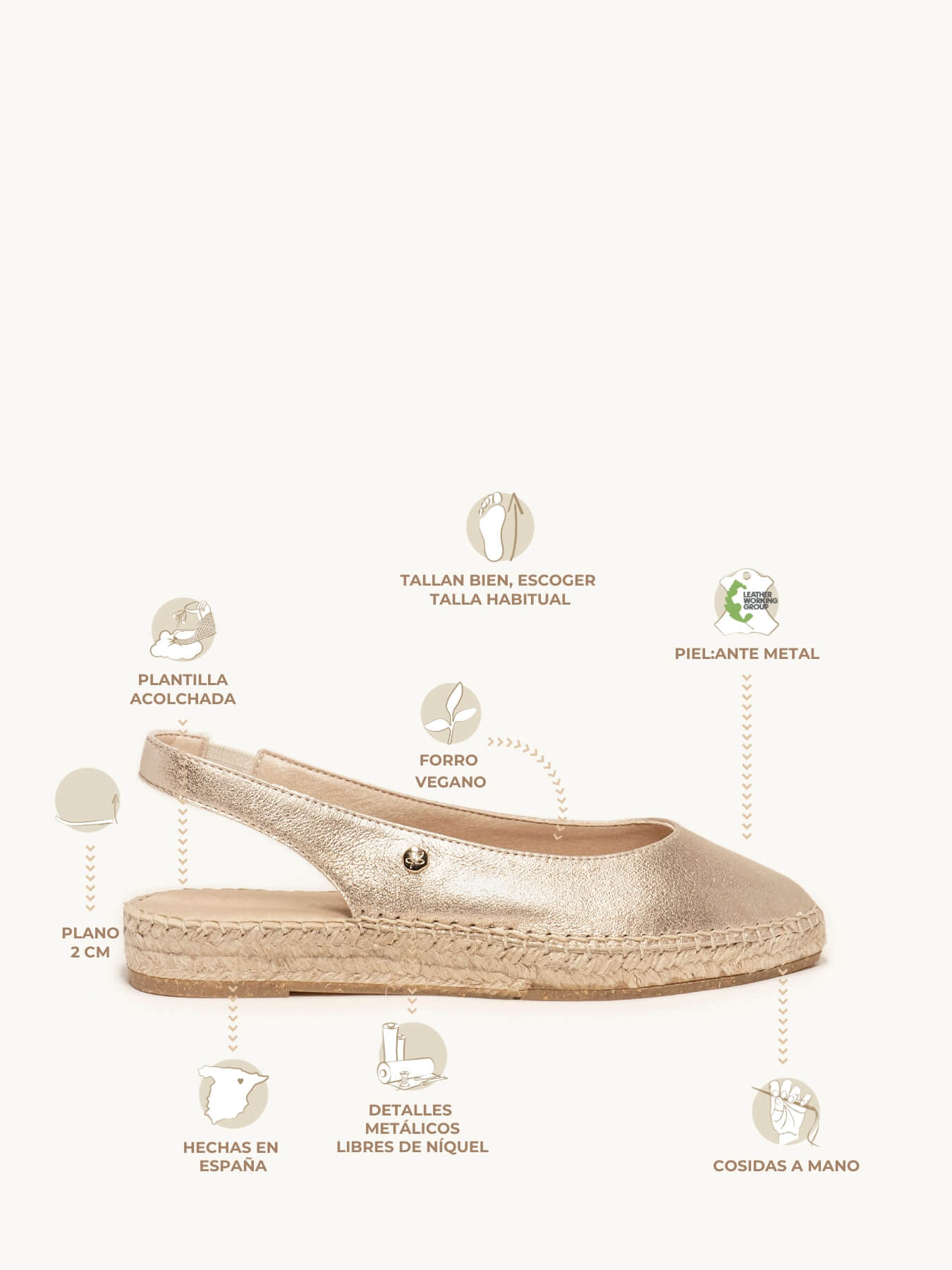 - El Ante Metal de la alpargata Camelia está certificada por el Leather Working Group (una organización que promueve prácticas ambientales sostenibles) El forro y la plantilla son de micro fibra transpirable y anti bacteriana. Suela de trenza de Yute natural con goma reciclada mezclada con fibras naturales. Elementos metálicos libres de níquel. Hilo de cosido a mano de algodón.