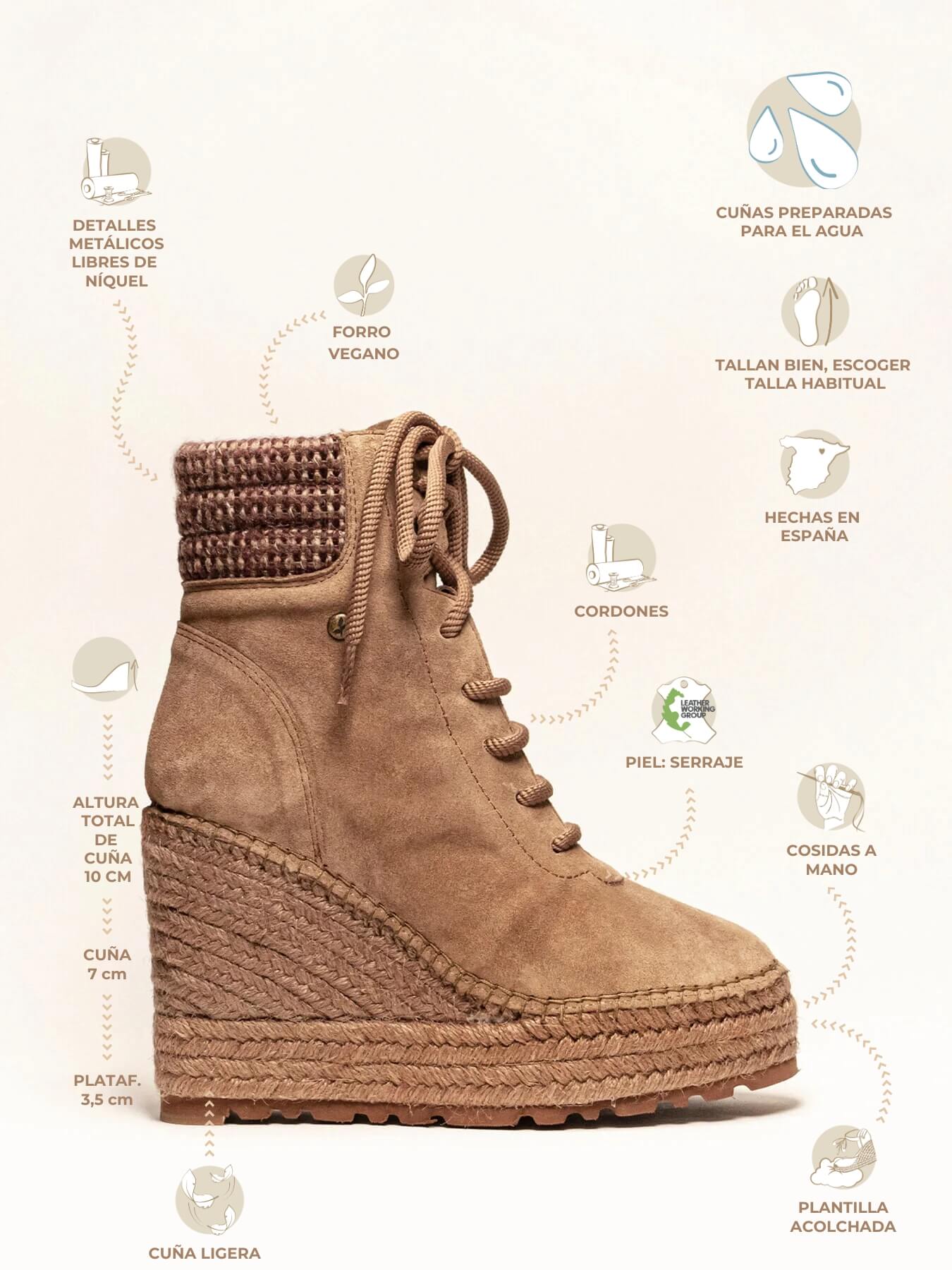 Quant à la pluie, si un jour elle vous surprend, SI ELLES SONT MOUILLÉES, RIEN NE SE PASSE !La cale en sparte est imperméable, nous l'avons préparée pour qu'elle repousse l'eau et résiste aux conditions passagères de l'hiver et du printemps.