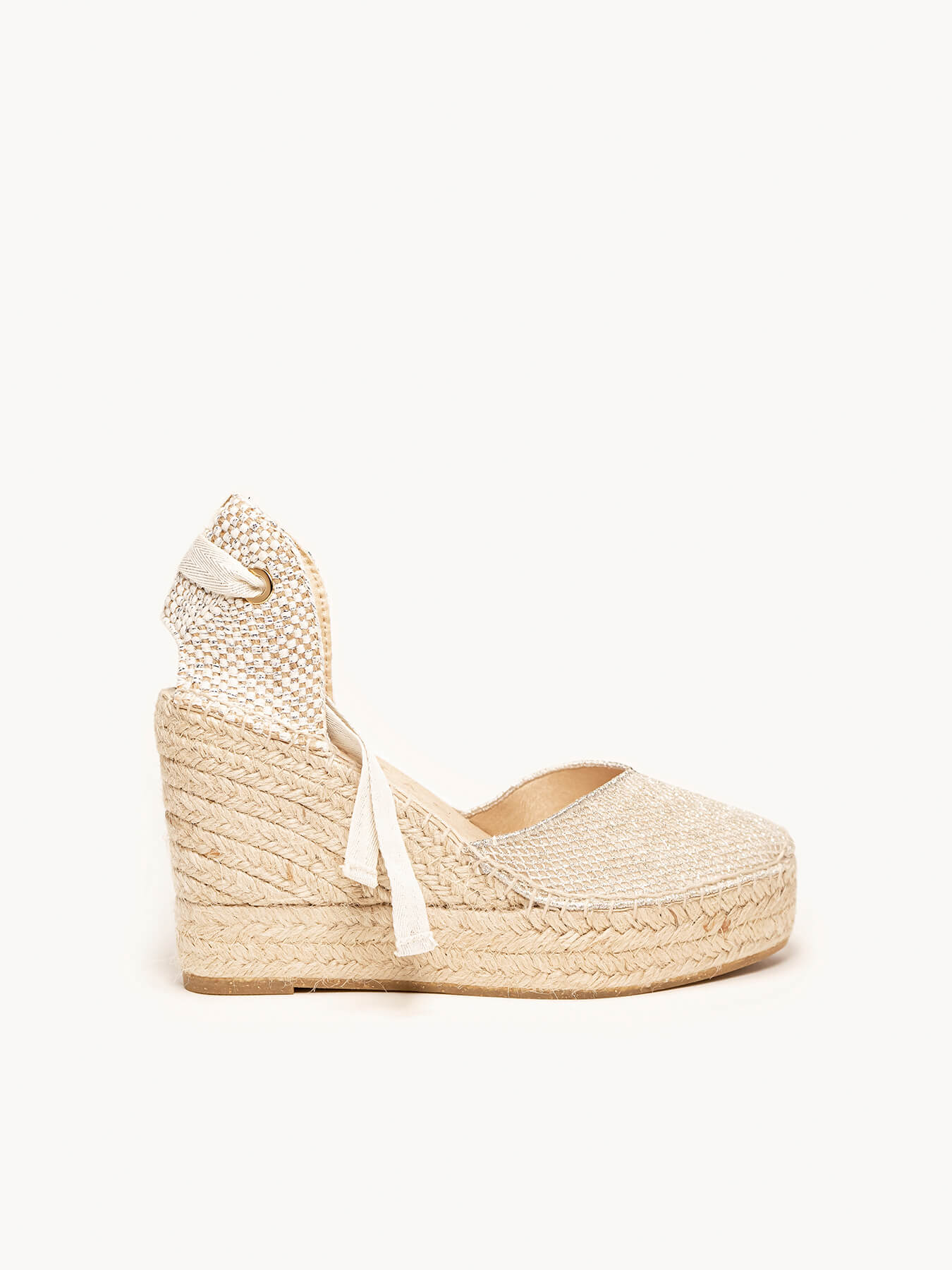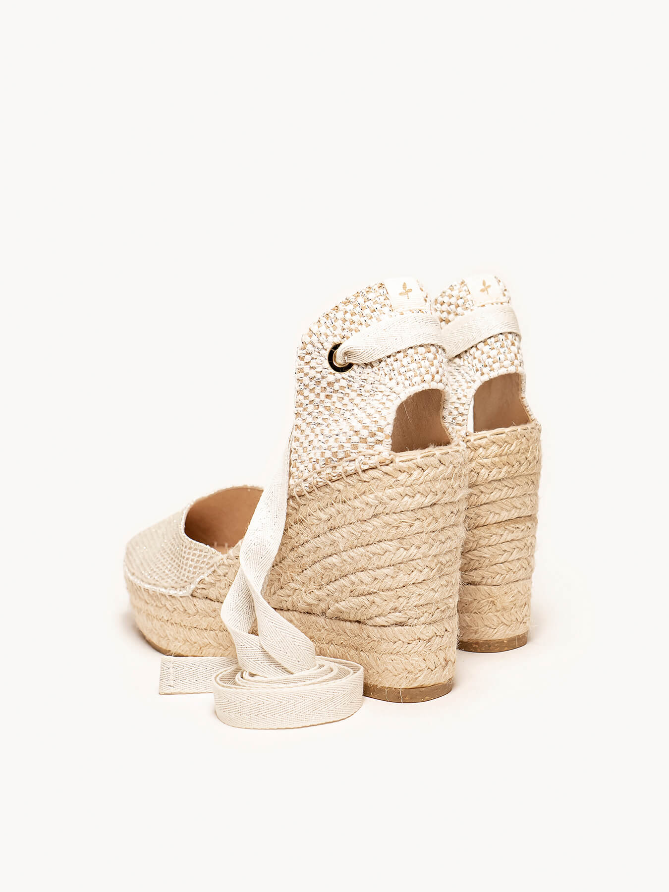 - Cuña de trenza de Yute natural con suela de goma reciclada mezclada con fibras naturales.
