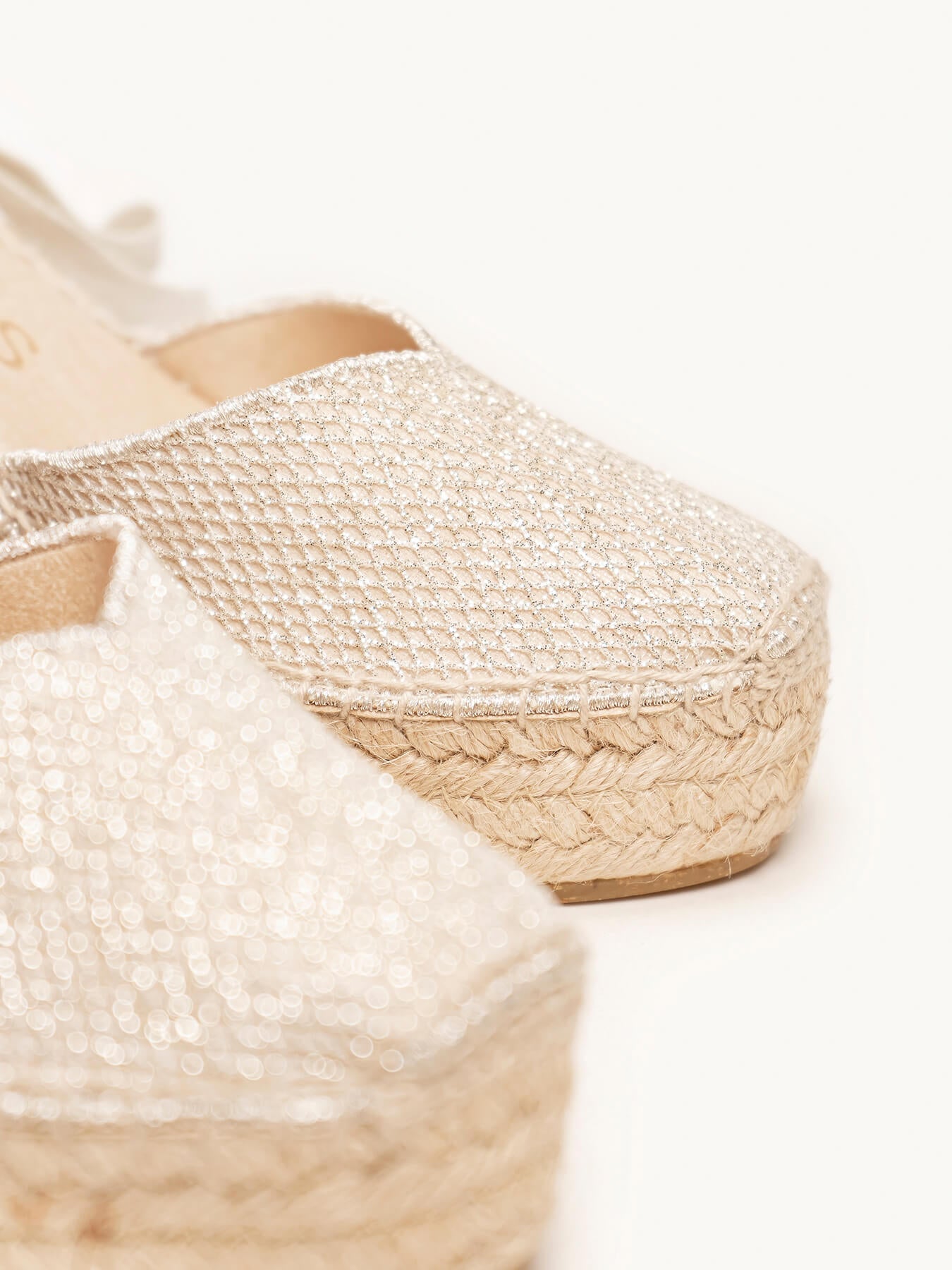 La alpargata de cuña alta Romero, es uno de nuestros modelos más especiales, perfecto para tu día. Las alpargatas de novia que podrás elegir como primera opción o como alpargatas de cambio. Conservarás la altura, sus cintas darán ese toque especial a tu vestido y llevarás las alpargatas cómodas que te permitirán disfrutar al máximo.