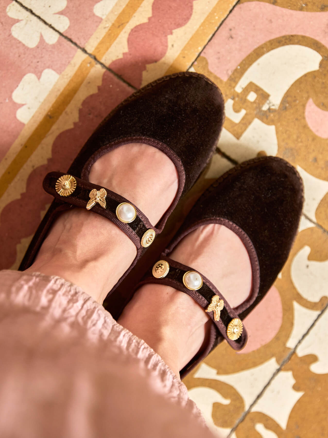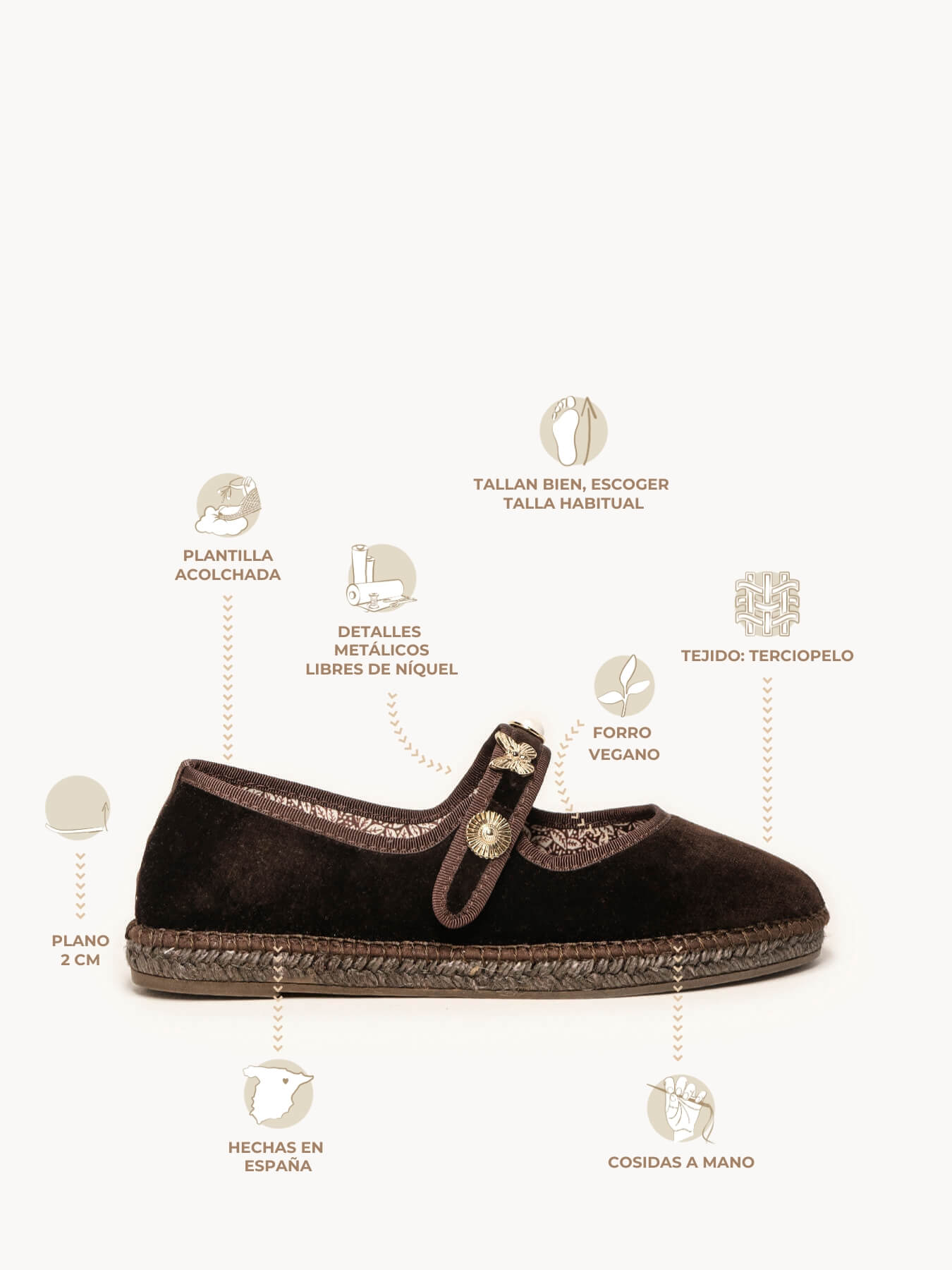 El modelo Adelfa es nuestra bailarina estilo Mary Jane que se viste de terciopelo con tachas. La podrás llevar tanto dentro como fuera de casa. Lleva una pequeña pulsera con hebilla para sujetar bien. Son muy cómodas y gracias a la forma de la punta, verás tu pie super estilizado.
