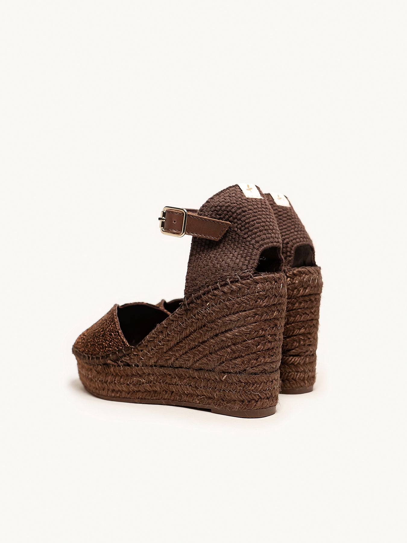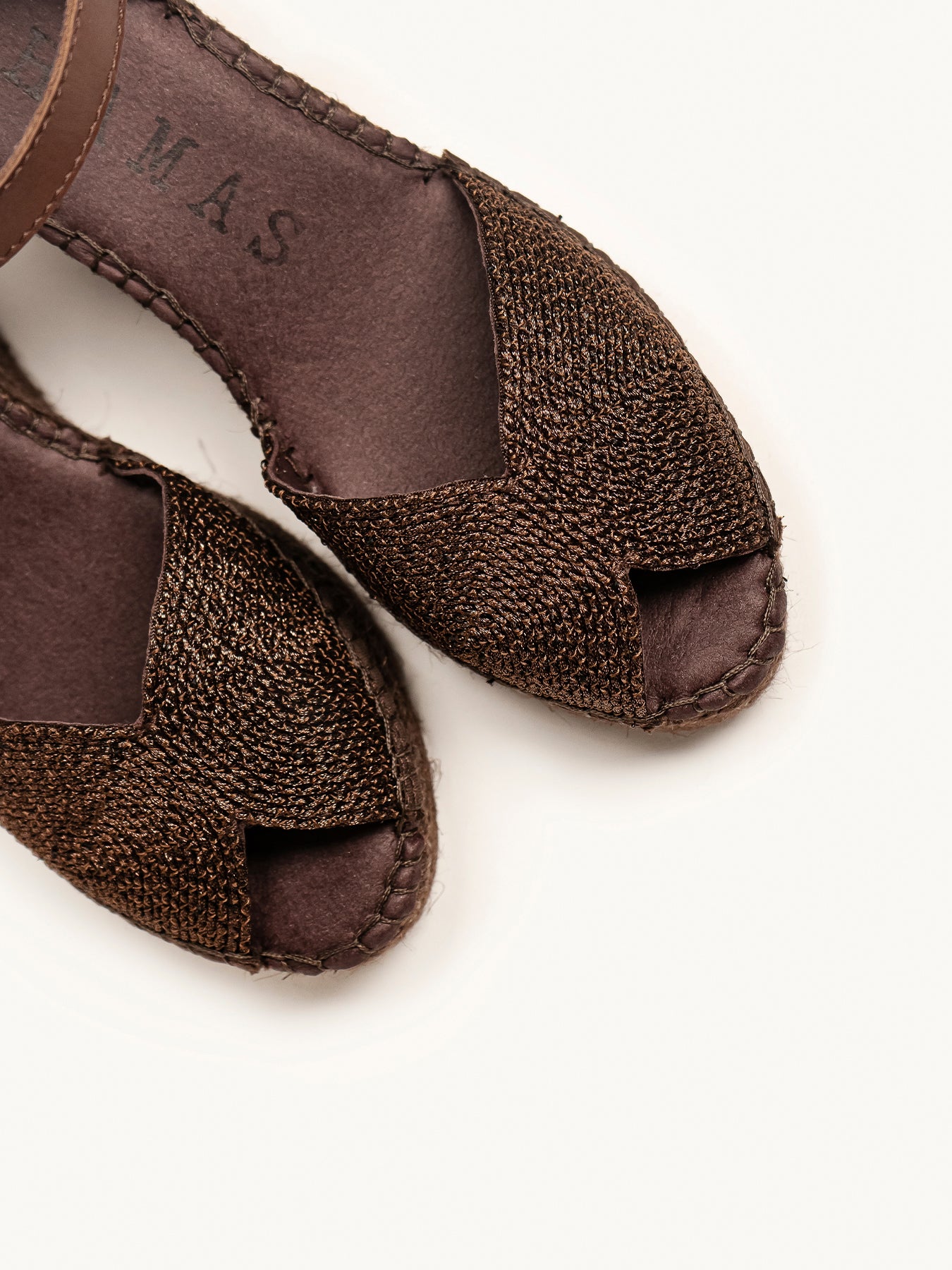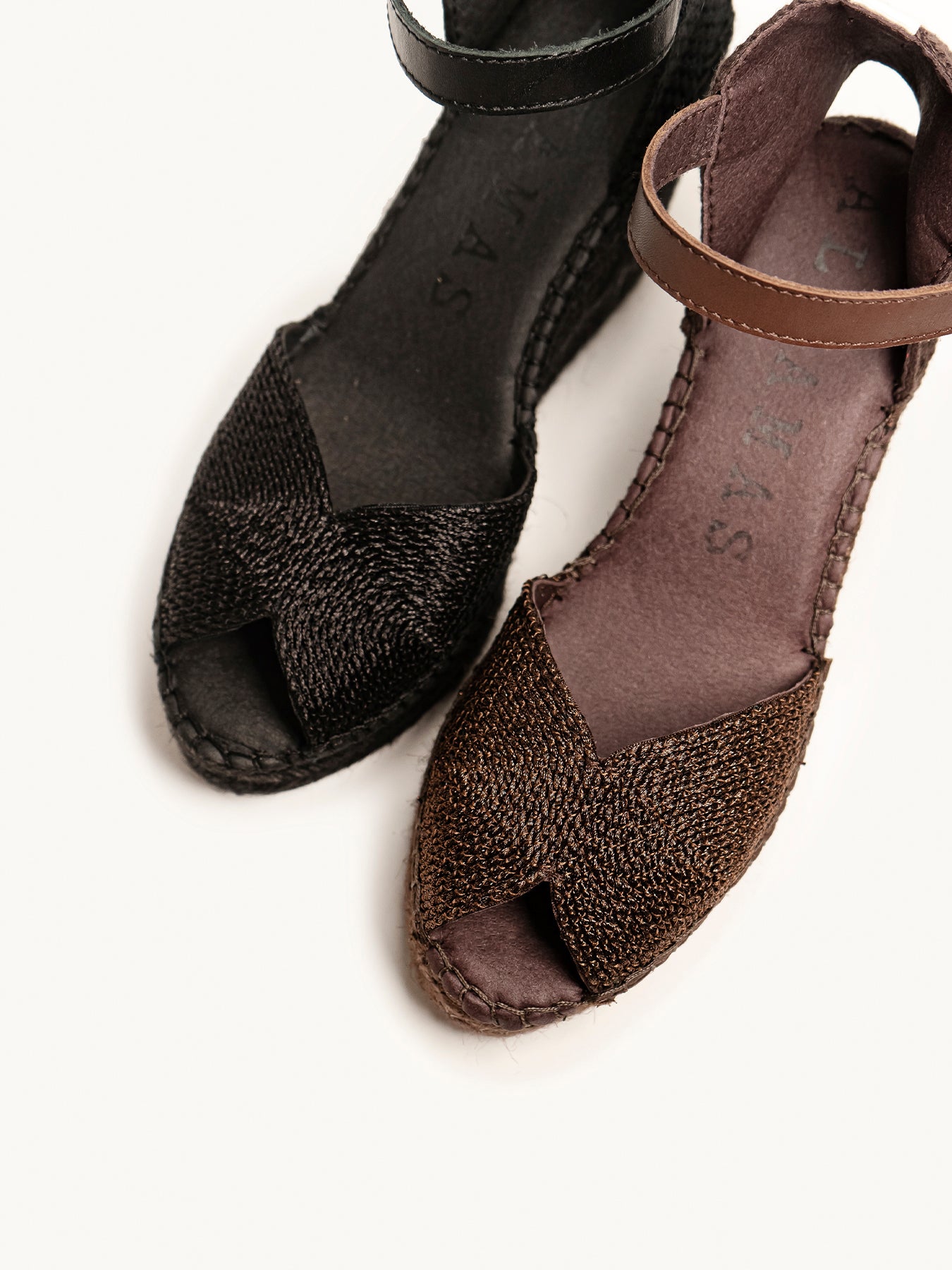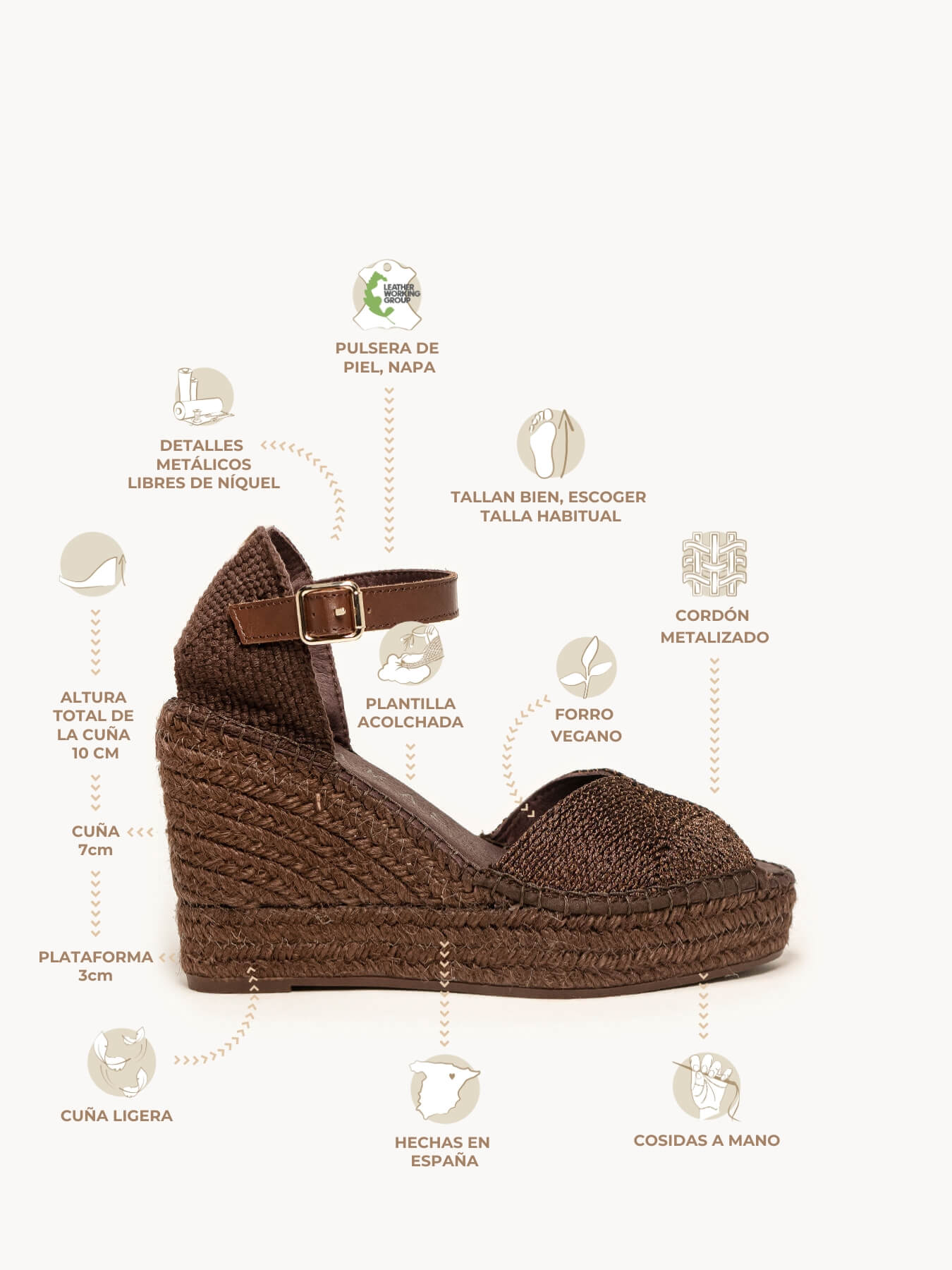 - Cuña de trenza de yute tintada con suela de goma reciclada y mezclada con fibras naturales.