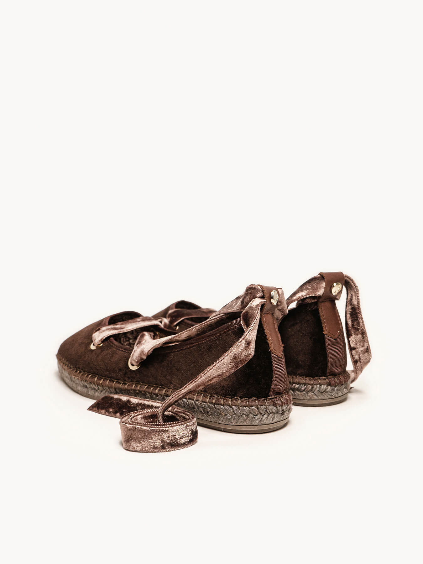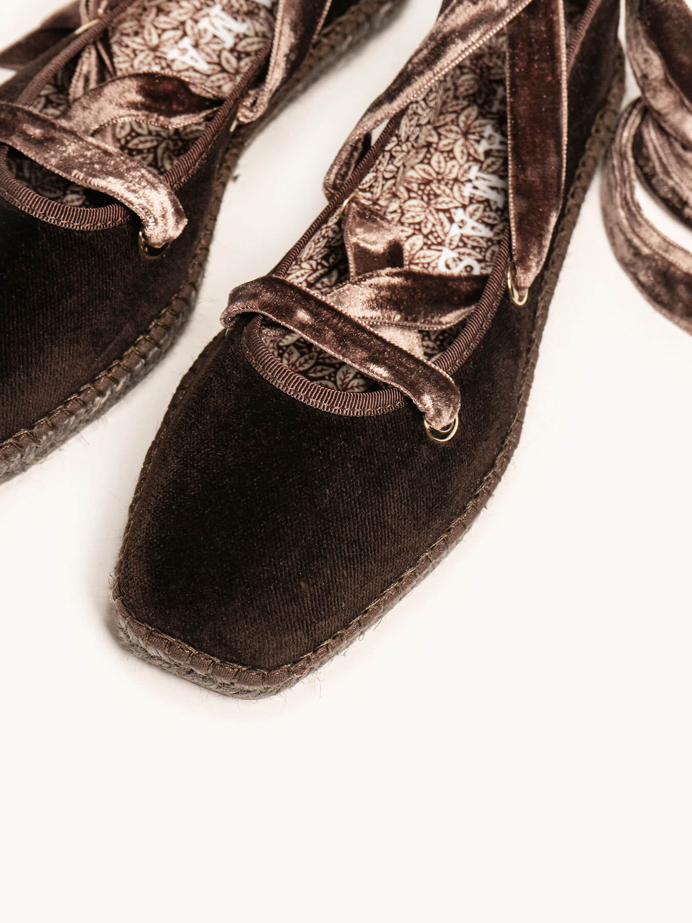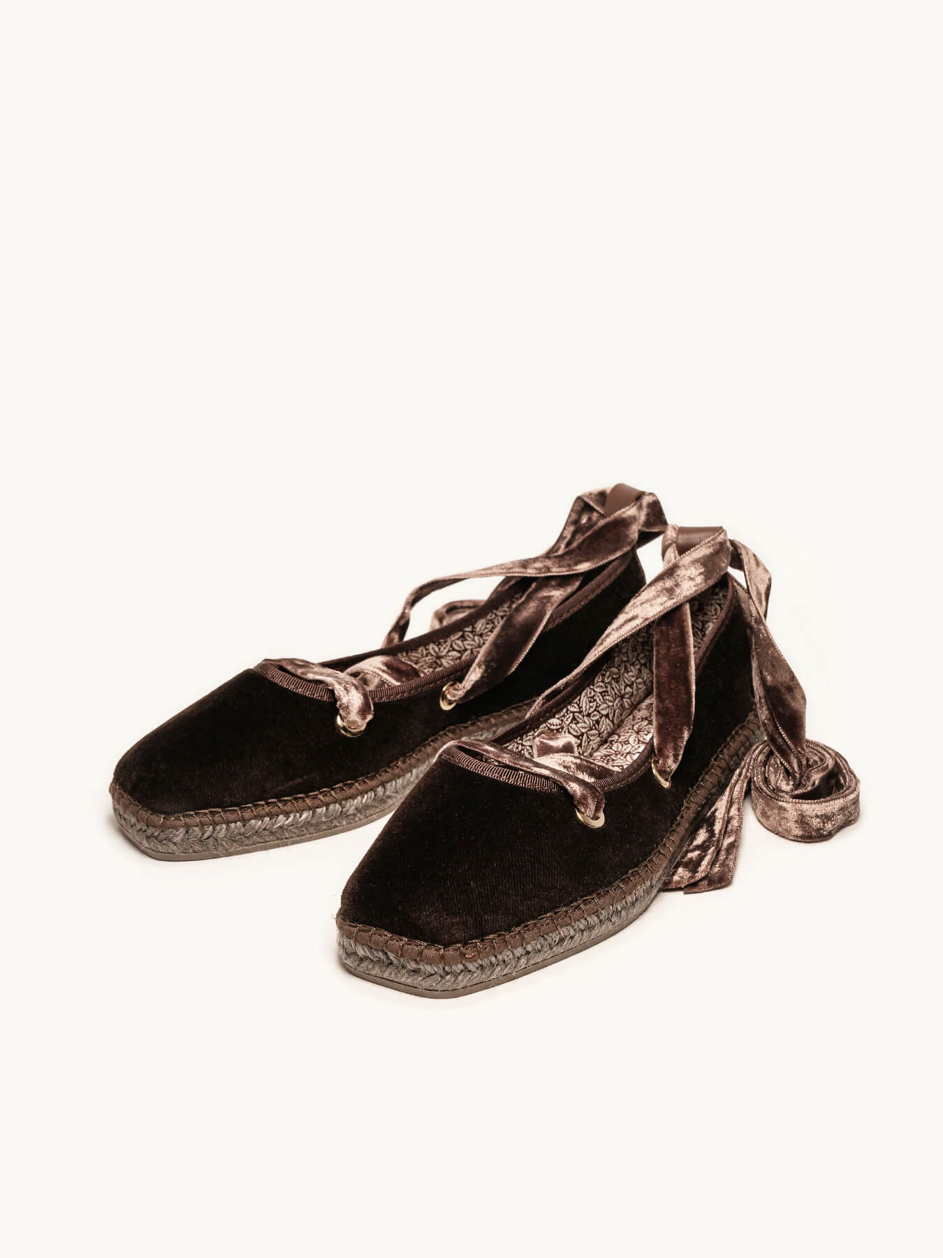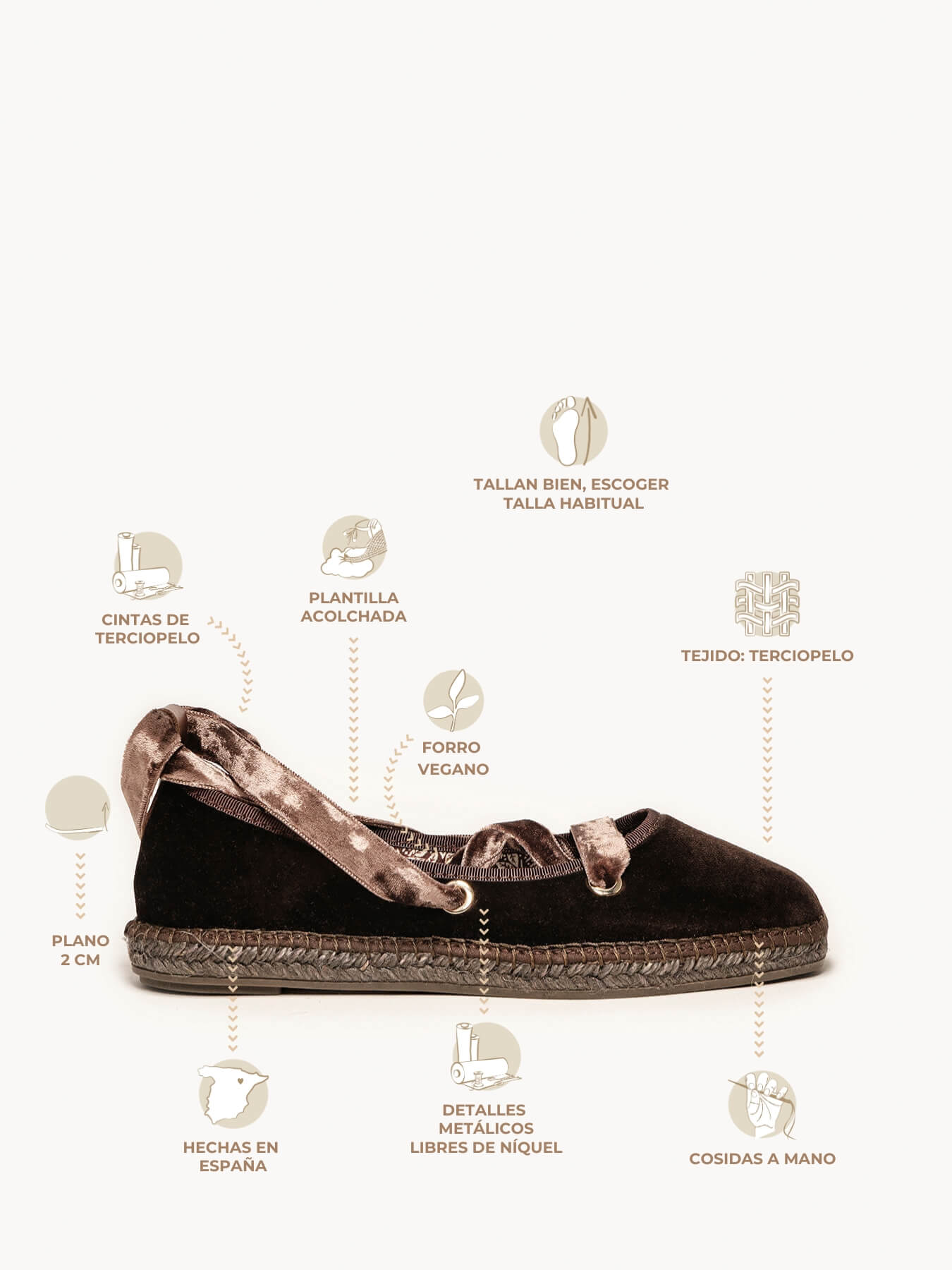 El modelo Begonia, es nuestra bailarina de terciopelo con cintas. La podrás llevar tanto dentro como fuera de casa. Al ser planas son super ligeras y cómodas. Gracias a la forma cuadrada de la punta, verás tu pie super estilizado.