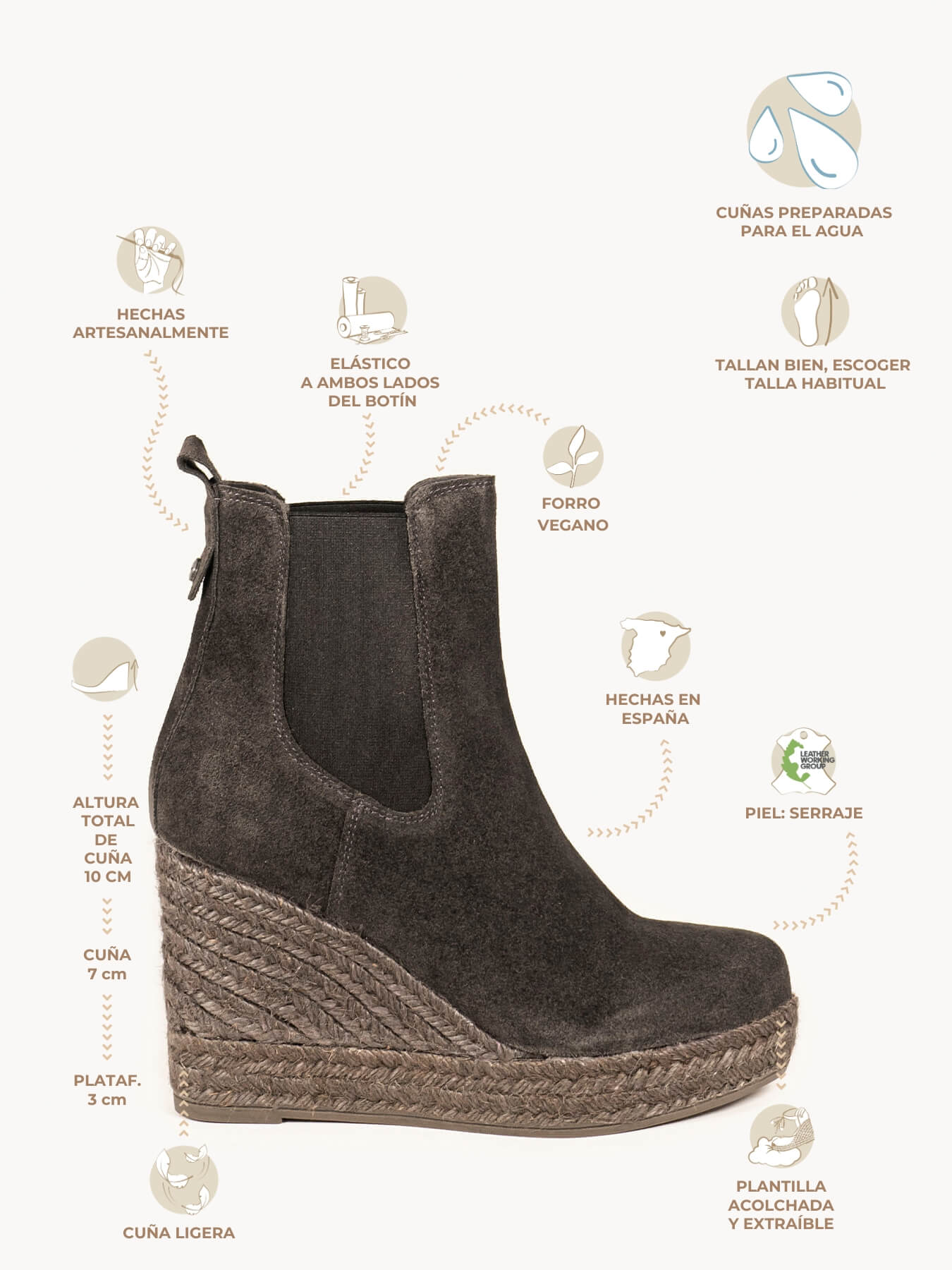 - El Serraje del modelo Ciprés está certificado por el Leather Working Group (una organización que promueve prácticas ambientales sostenibles) combinado con elástico al tono.