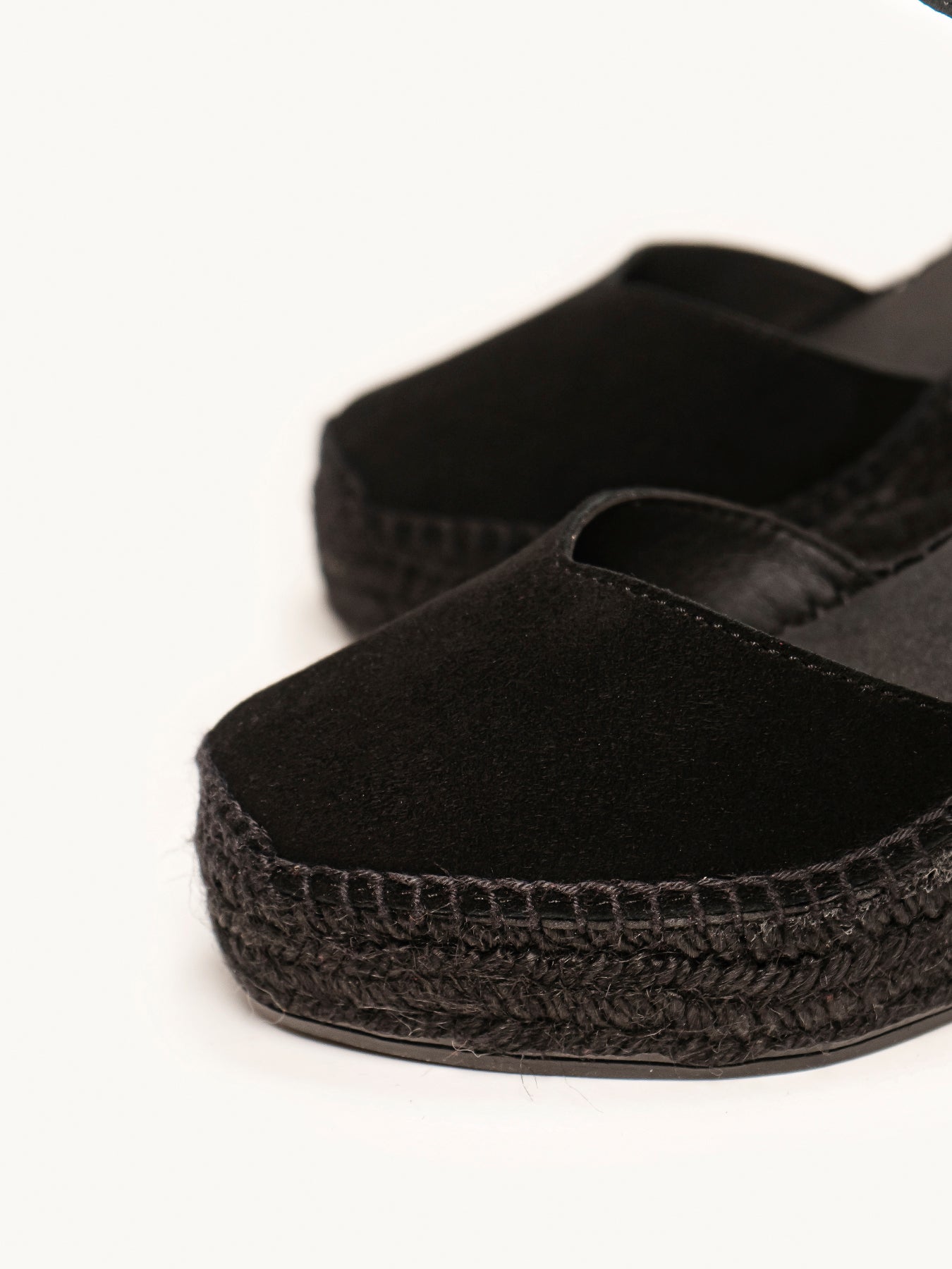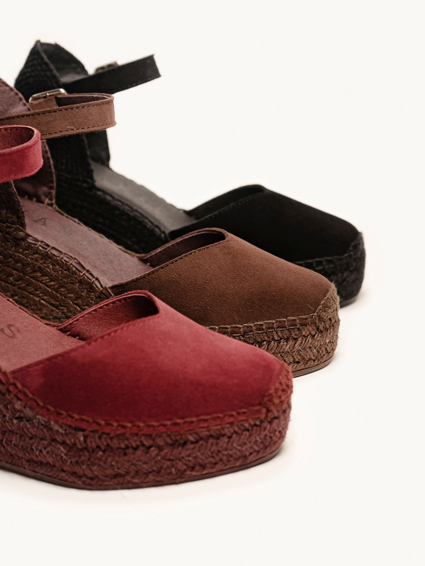 - Cuña de trenza de Yute tintado con suela de goma reciclada, mezclada con fibras naturales.