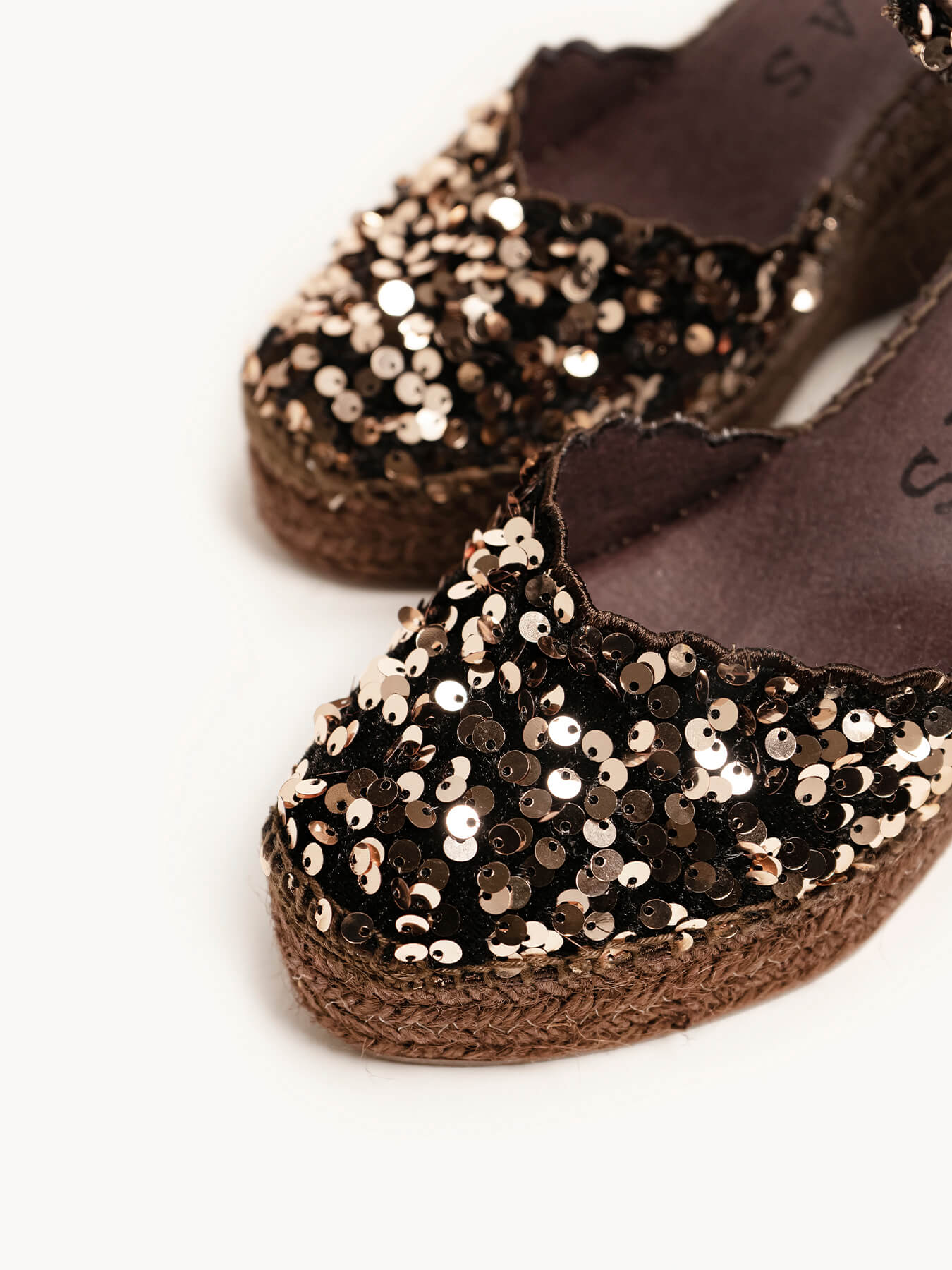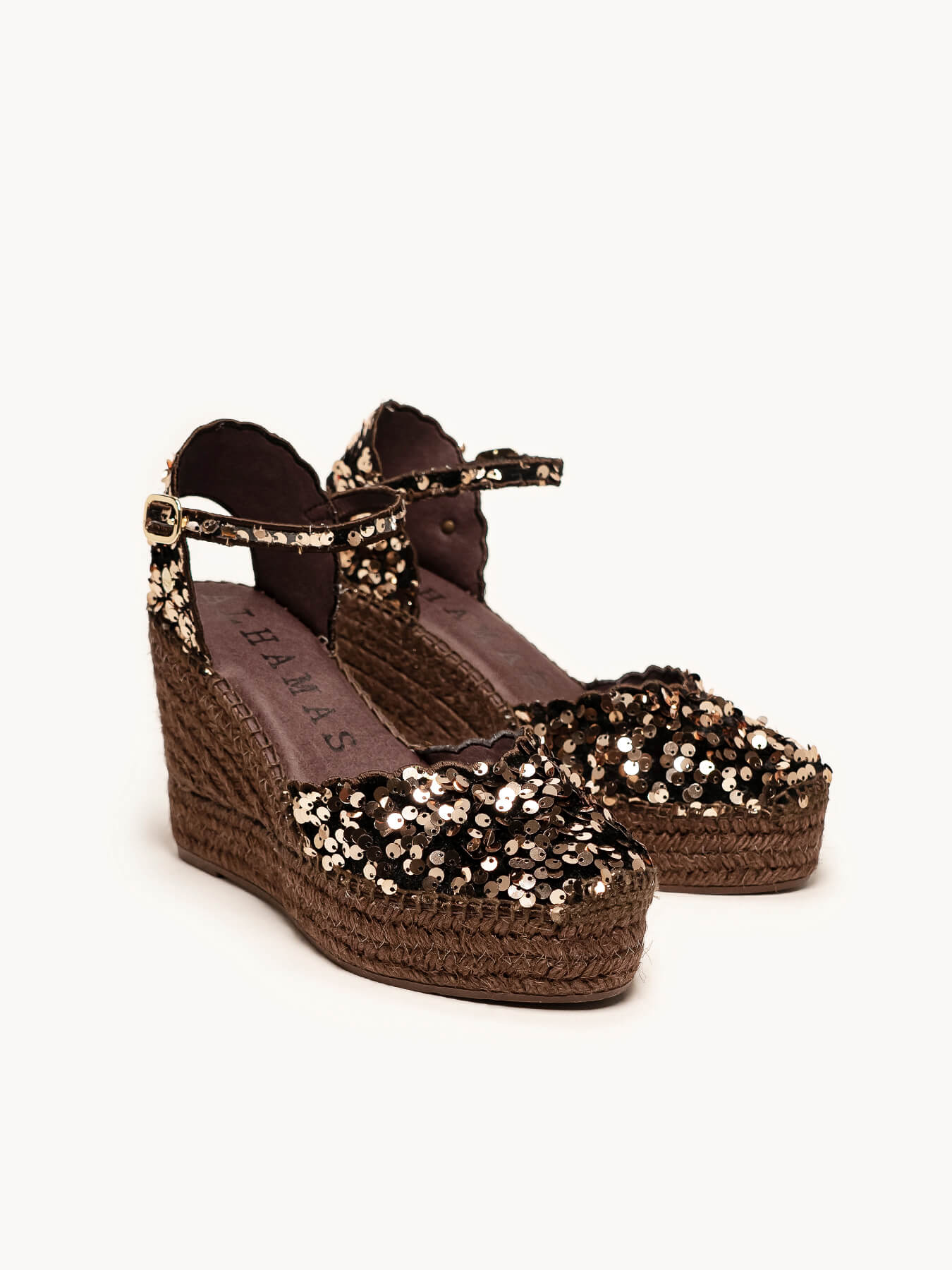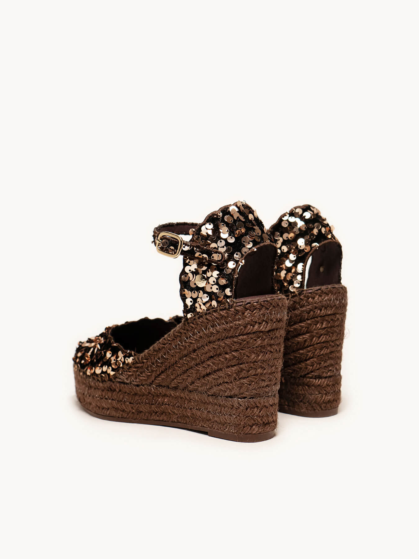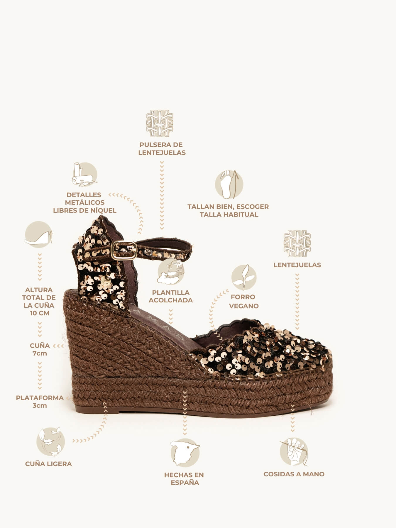 - Cuña de trenza de Yute tintado con suela de goma reciclada, mezclada con fibras naturales.