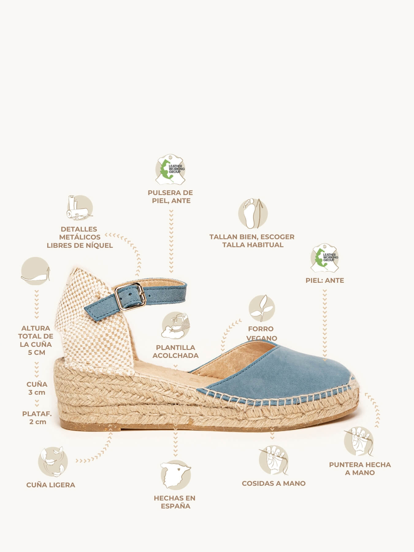 - El Ante de la alpargata Jara está certificado por el Leather Working Group (una organización que promueve prácticas ambientales sostenibles)