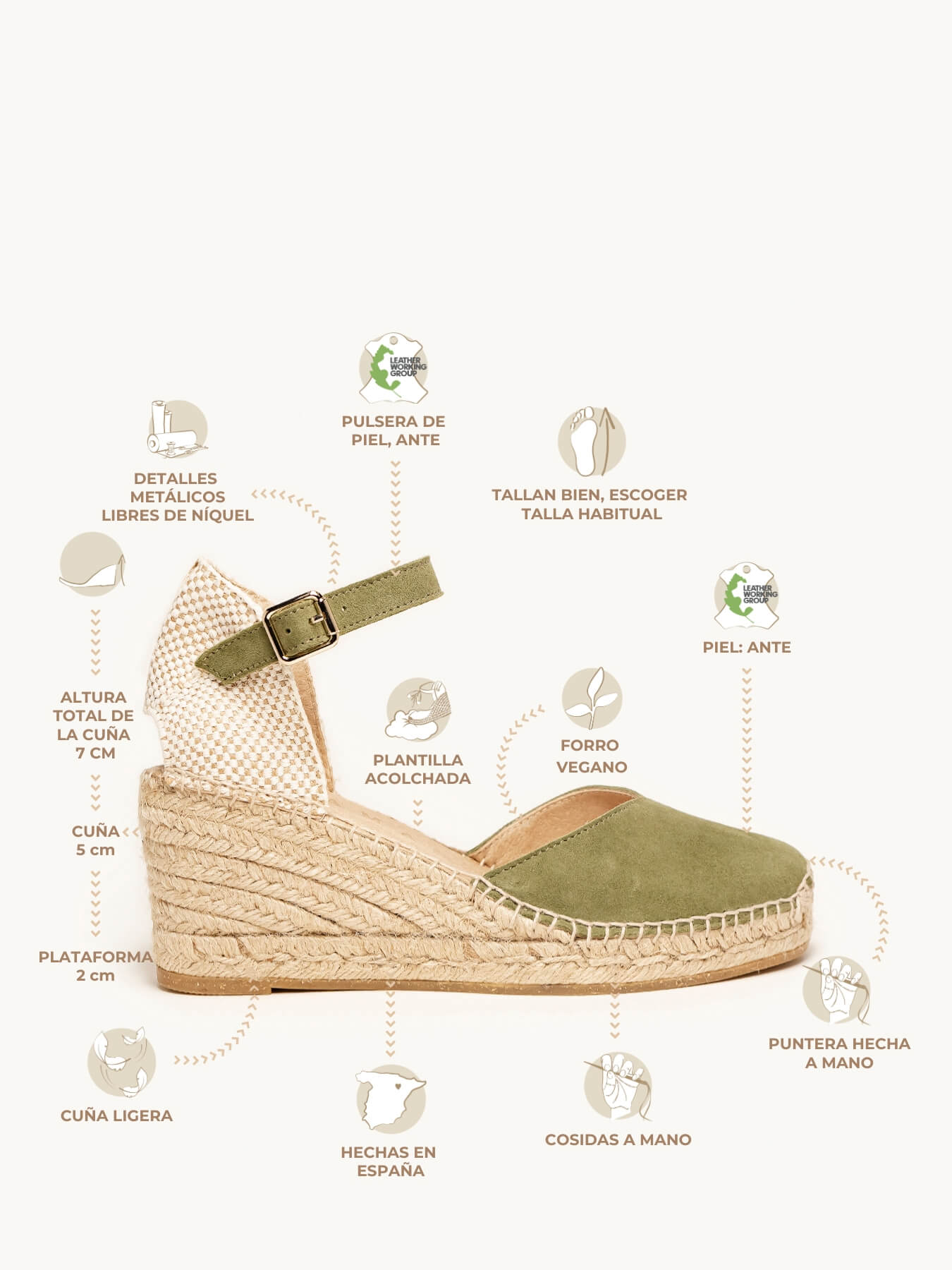 - El Ante de la alpargata Jara está certificado por el Leather Working Group (una organización que promueve prácticas ambientales sostenibles)