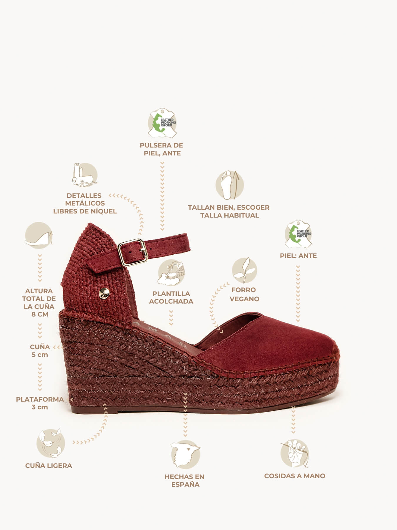 - El Ante de la alpargata Jara está certificado por el Leather Working Group (una organización que promueve prácticas ambientales sostenibles)