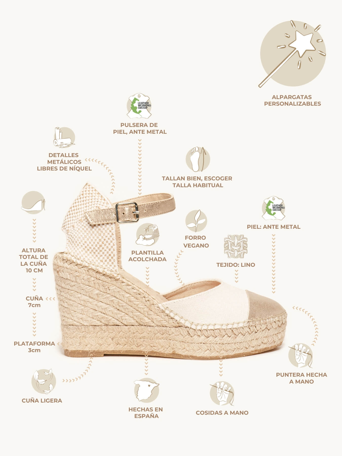 • Alpargata Cuña Alta: 10 cm totales (3 de plataforma + 7 de cuña).