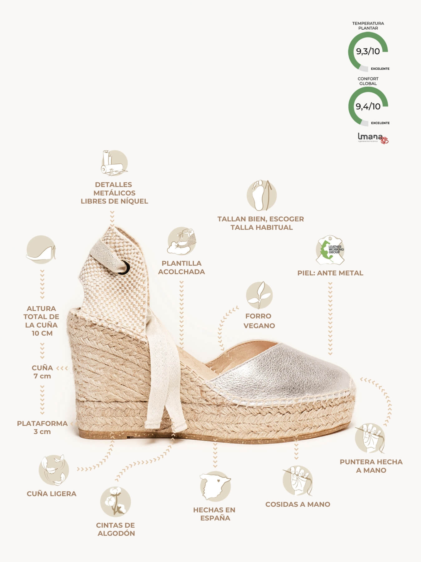 - Cuña de trenza de Yute natural con suela de goma reciclada mezclada con fibras naturales.
