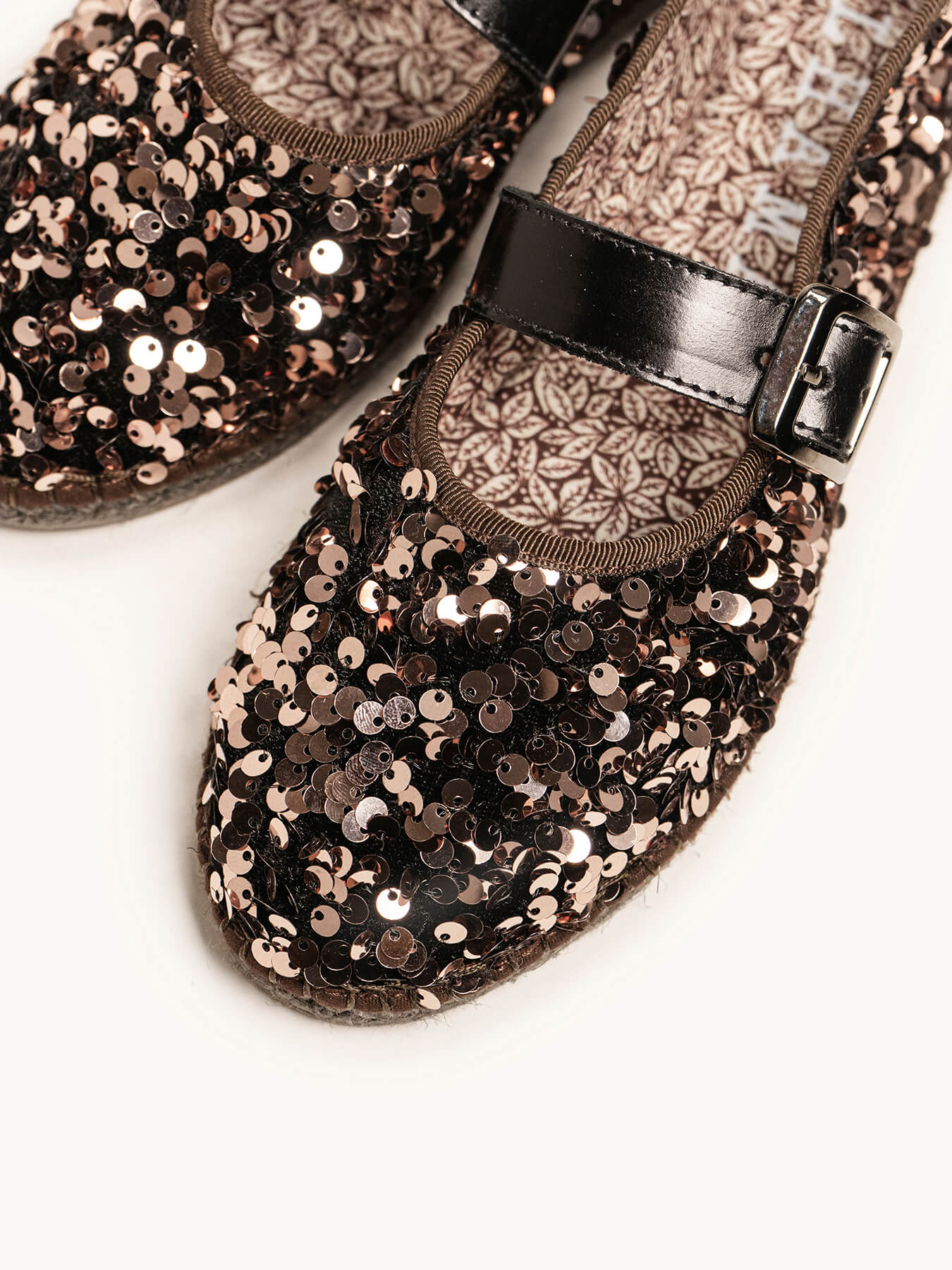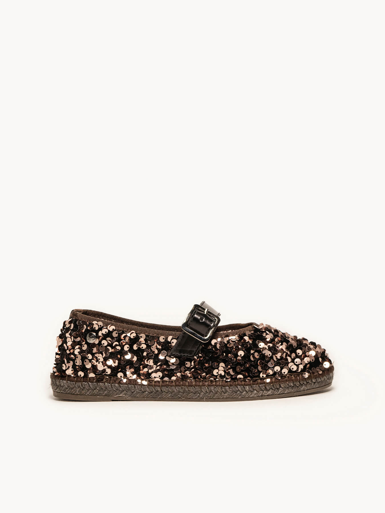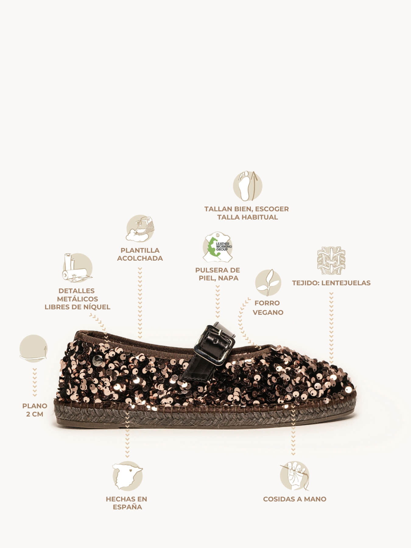El modelo Vero es nuestra bailarina estilo Mary Jane que en esta ocasión se viste de lentejuelas. La podrás llevar tanto dentro como fuera de casa. Lleva una pulsera de piel con hebilla para sujetar bien. Son muy cómodas y gracias a la forma de la punta, verás tu pie super estilizado..
