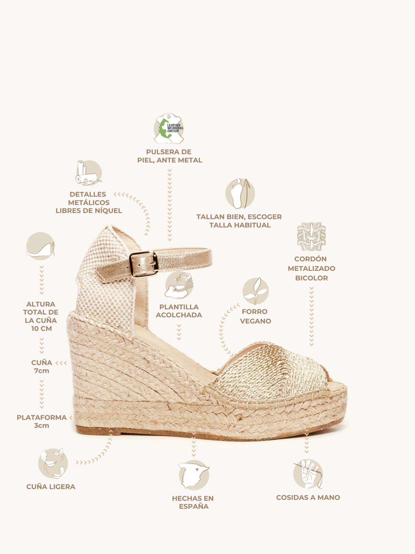 - Cunha trançada de juta natural com sola de borracha reciclada misturada com fibras naturais.