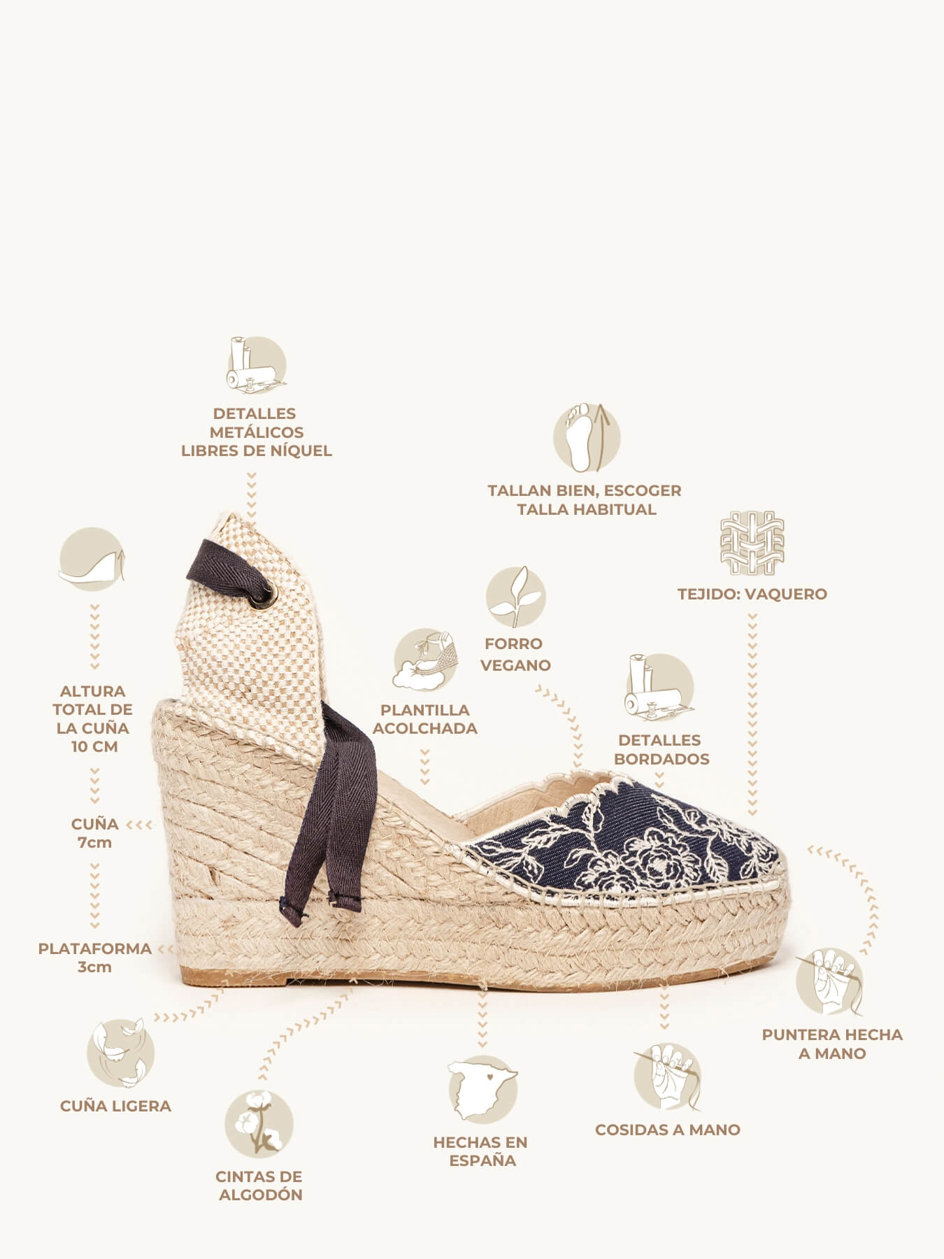 A espadrille de cunha alta Romero, é o nosso modelo mais icónico. Uma alpargata valenciana com decote em coração e fitas que pode usar com os seus looks especiais e também com os seus looks do dia a dia. Poderá dar-lhe um toque especial porque as fitas podem ser mudadas.