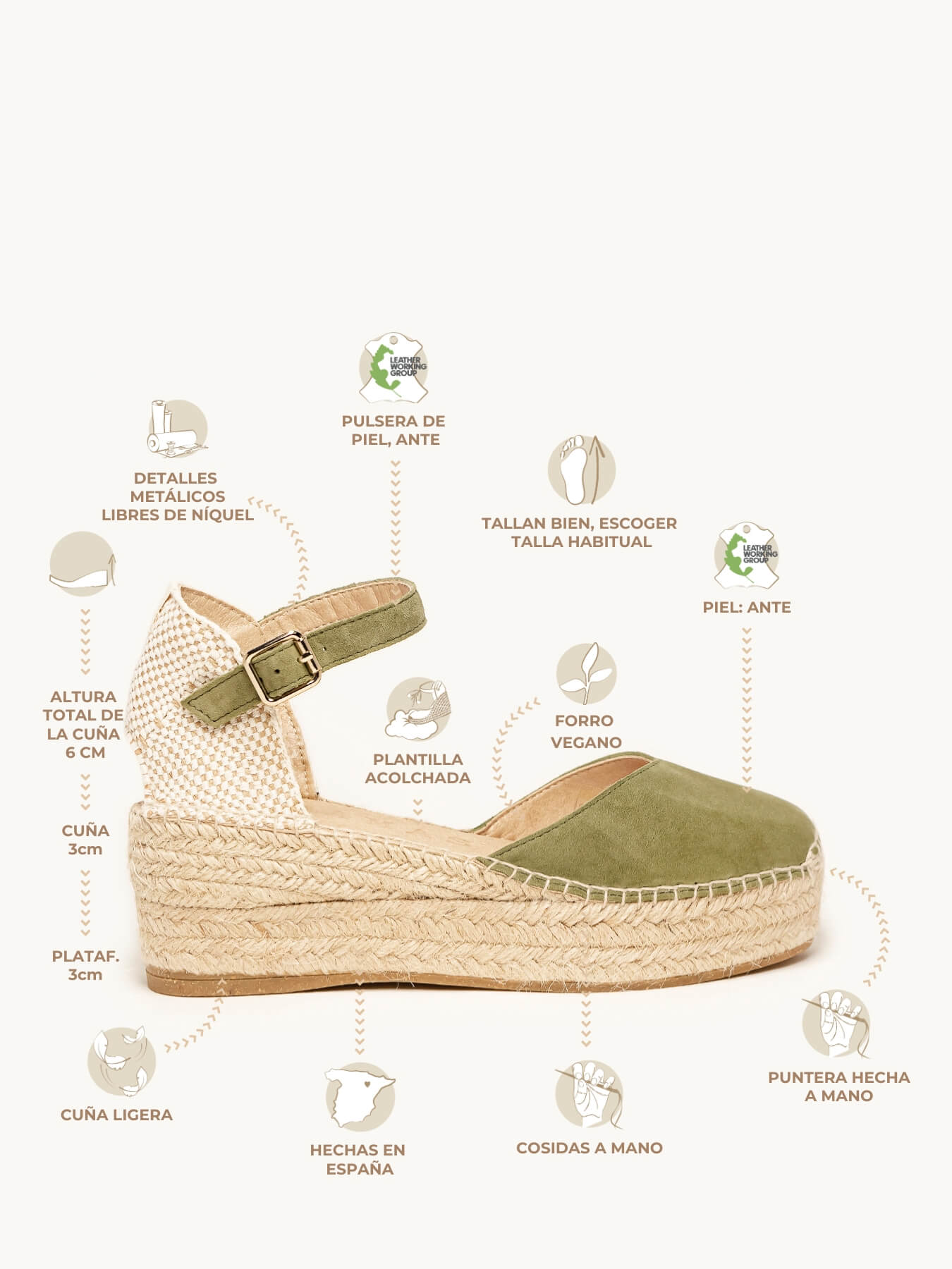 - El Ante de la alpargata Jara está certificado por el Leather Working Group (una organización que promueve prácticas ambientales sostenibles)