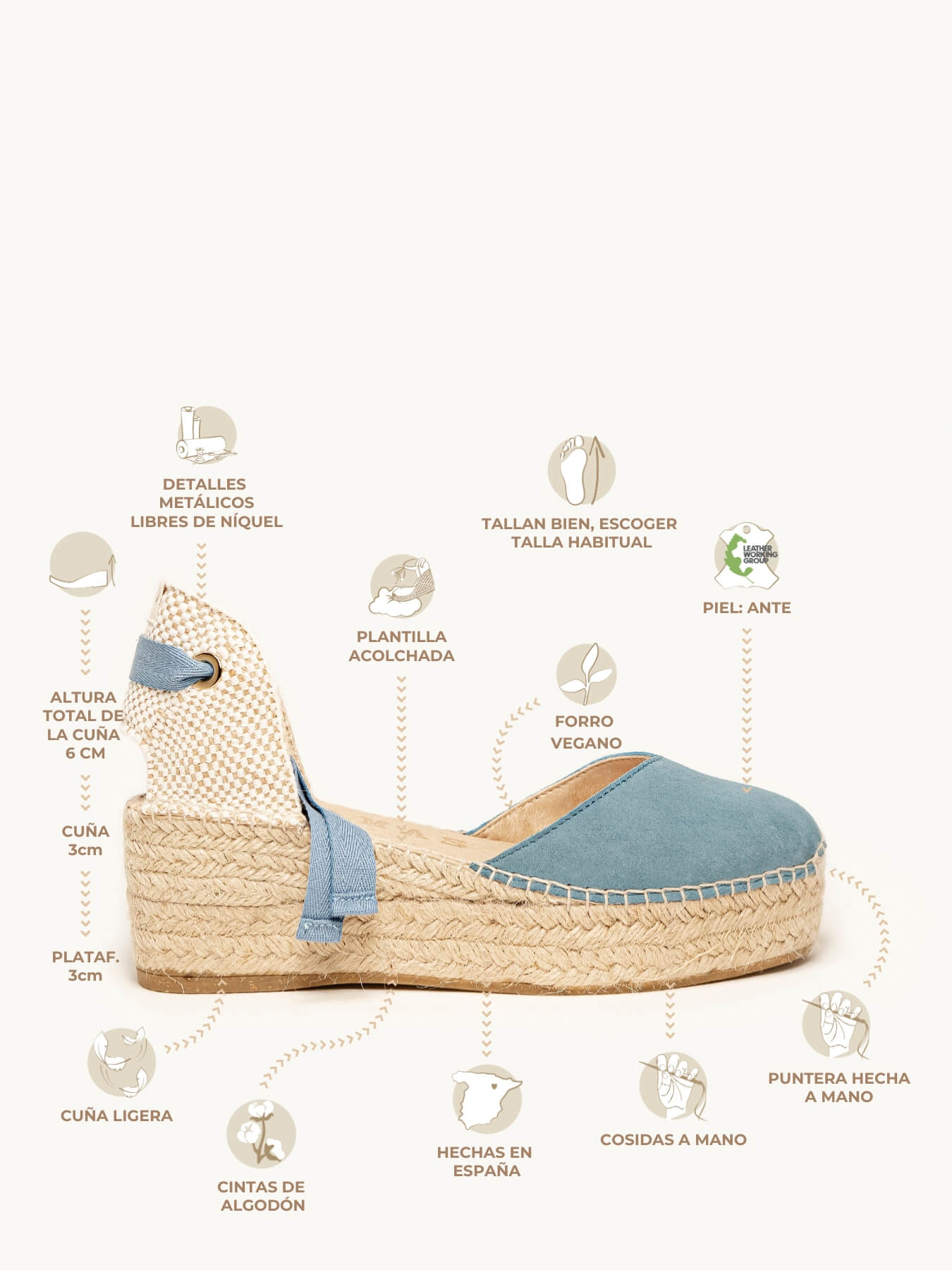 - El Ante de la alpargata Romero está certificado por el Leather Working Group (una organización que promueve prácticas ambientales sostenibles)