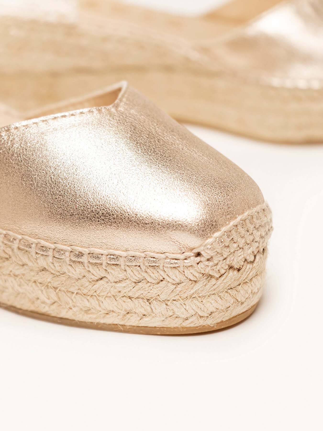 - Cuña de trenza de Yute natural con suela de goma reciclada mezclada con fibras naturales.